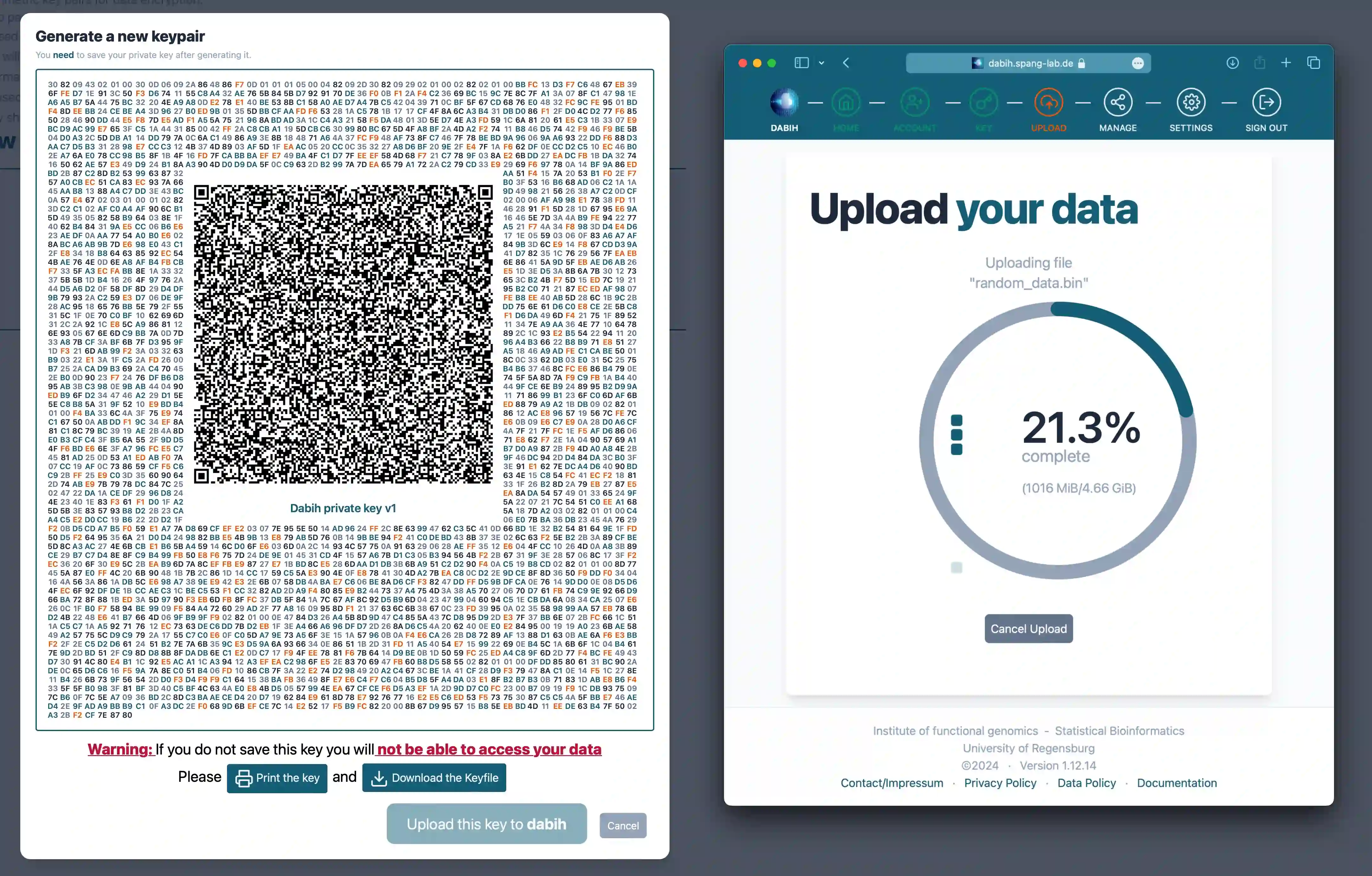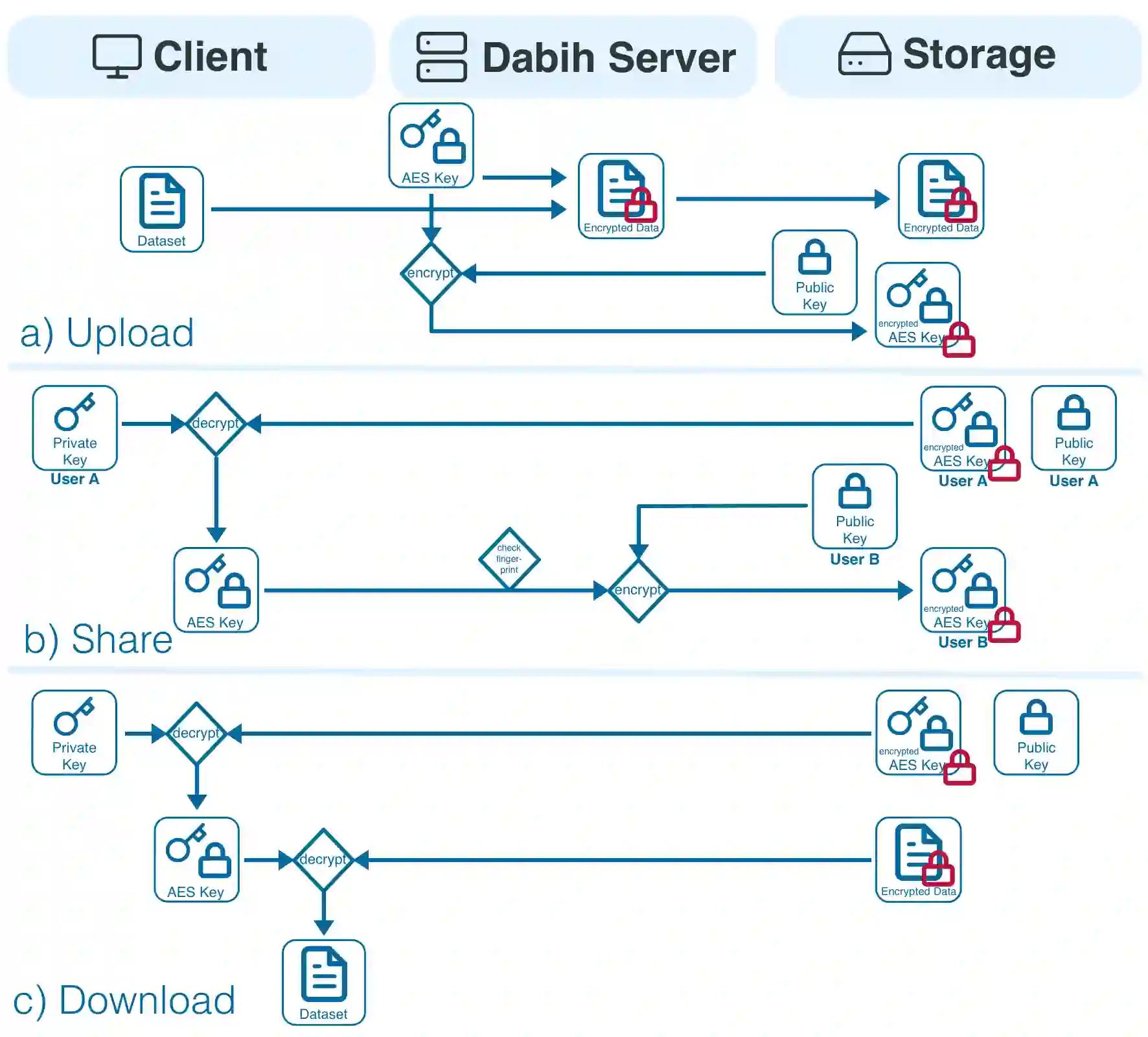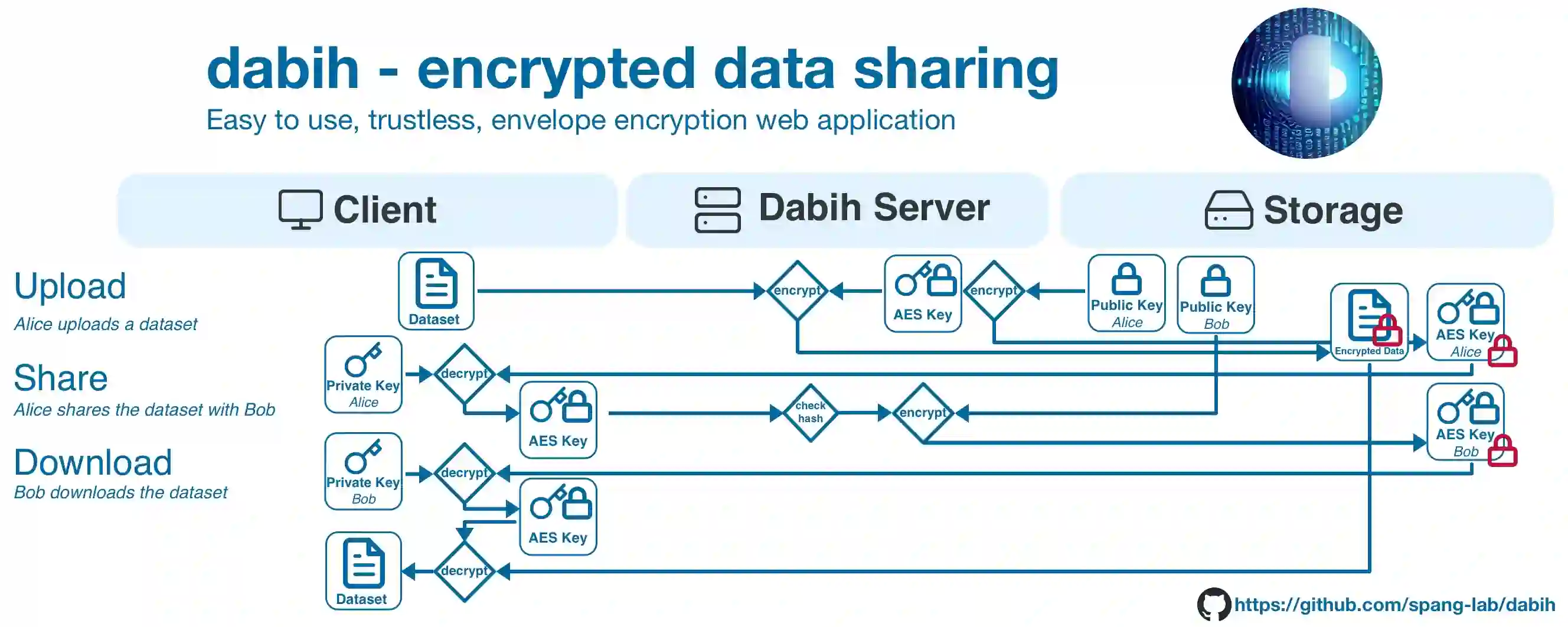 Background: The secure management of sensitive clinical data, particularly human genomics data, has become a critical requirement in modern biomedical research. Although the necessary software and algorithms are readily available, their use by non-IT experts poses significant challenges. Methods: We developed dabih, an open-source web application specifically designed to facilitate user-friendly encrypted data management. dabih enables web-based uploading, storing, sharing, and downloading of sensitive data in any format. Its approach to data security involves a two-stage envelope encryption process. We combine symmetric-key encryption for data and public-key encryption as key encapsulation mechanism. The private key necessary for decrypting the data remains exclusively on the owner's device. Thus, accessing data is impossible without explicit permission from the keyholder. Results: dabih is available open-source on GitHub https://github.com/spang-lab/dabih, as ready to use containers on docker hub and includes a command line interface and a graphical bulk upload tool as pre-built binaries. Documentation is available as part of the web application. Conclusions: dabih enables everyone to use strong cryptography for their data, while being just as simple to use as other, non-encrypted, data storage solutions. All the cryptography occurs seamlessly in the background as users interact with a secure web portal, simply by dragging and dropping files.