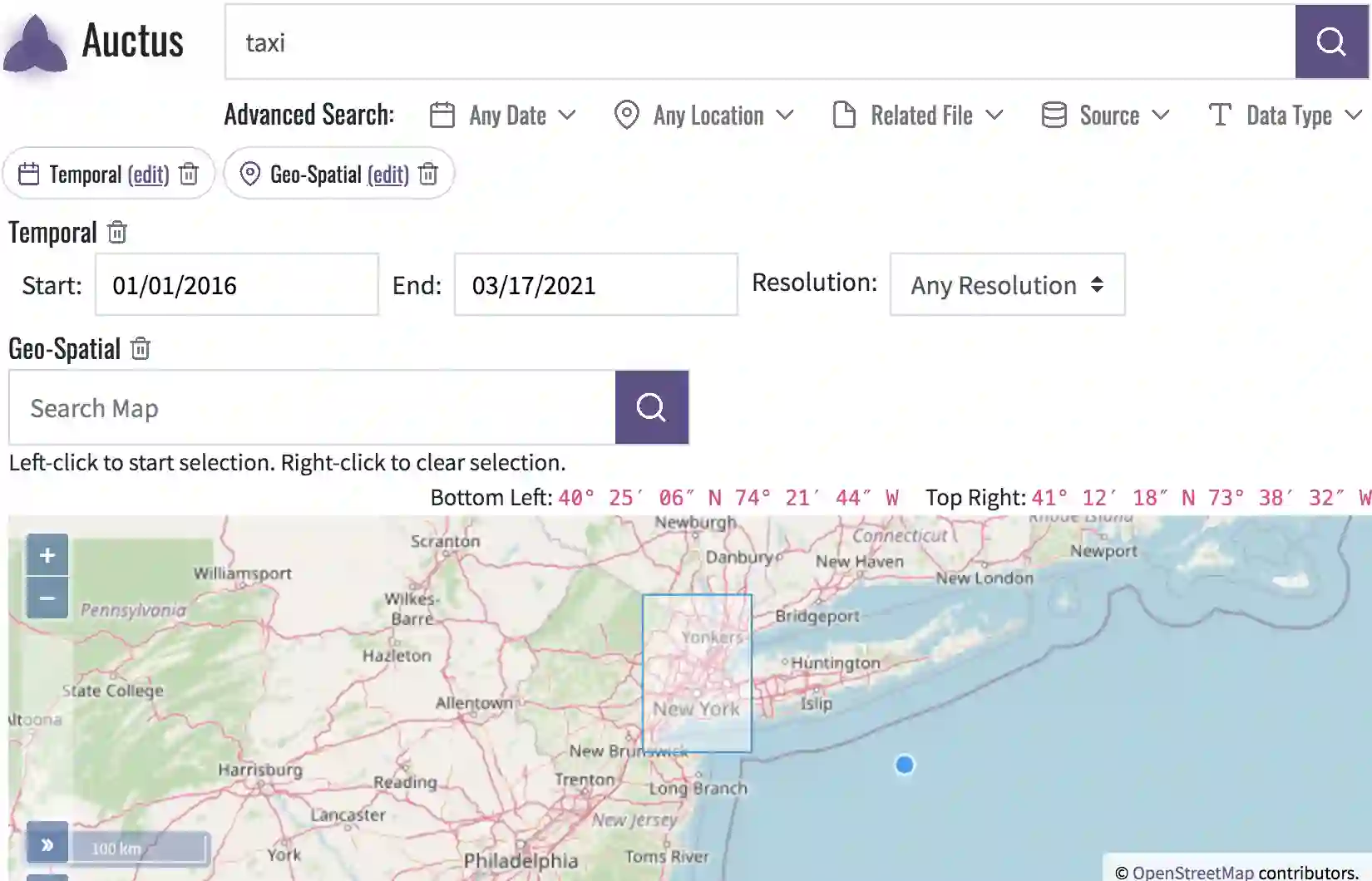 The large volumes of structured data currently available, from Web tables to open-data portals and enterprise data, open up new opportunities for progress in answering many important scientific, societal, and business questions. However, finding relevant data is difficult. While search engines have addressed this problem for Web documents, there are many new challenges involved in supporting the discovery of structured data. We demonstrate how the Auctus dataset search engine addresses some of these challenges. We describe the system architecture and how users can explore datasets through a rich set of queries. We also present case studies which show how Auctus supports data augmentation to improve machine learning models as well as to enrich analytics.