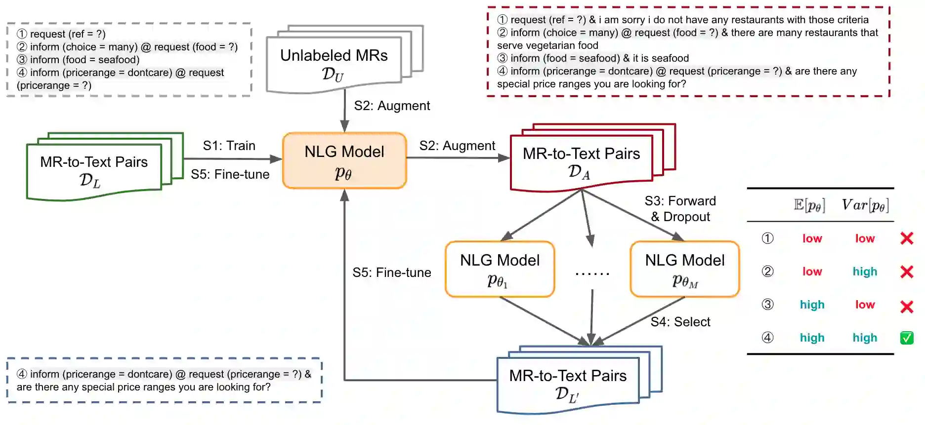 翻译:以任务为导向的对话系统中的自然语言生成模块(NLG)在任务为导向的对话系统中的自然语言生成模块将结构含义表示(MRs)转化为文本响应,这对用户作为人机互动界面的经验有很大影响,但在实践中,开发者往往只拥有少量附加说明的数据,而且要面对高额数据收集成本来建立NLG模块。在这项工作中,我们采用自培训框架来应对微弱的MR-Text生成问题。我们利用预先培训的语言模型来自我增强许多假标签数据。为了防止目标数据分配逐渐从目标数据流流向噪音增强的数据分配,我们提出了一个新的数据选择战略,以选择我们生成模型最不确定的数据。与现有的数据选择方法相比,我们的方法是:(1) 参数效率,它不需要培训任何额外的神经模型,(2) 计算效率,它只需要使用模型的若干随机前传来估计不确定性。我们在两个基准数据集上进行了实验:很少ShotWOZ和WIPShoSGD, 并显示我们提议的框架始终超越EUR的其他基准。