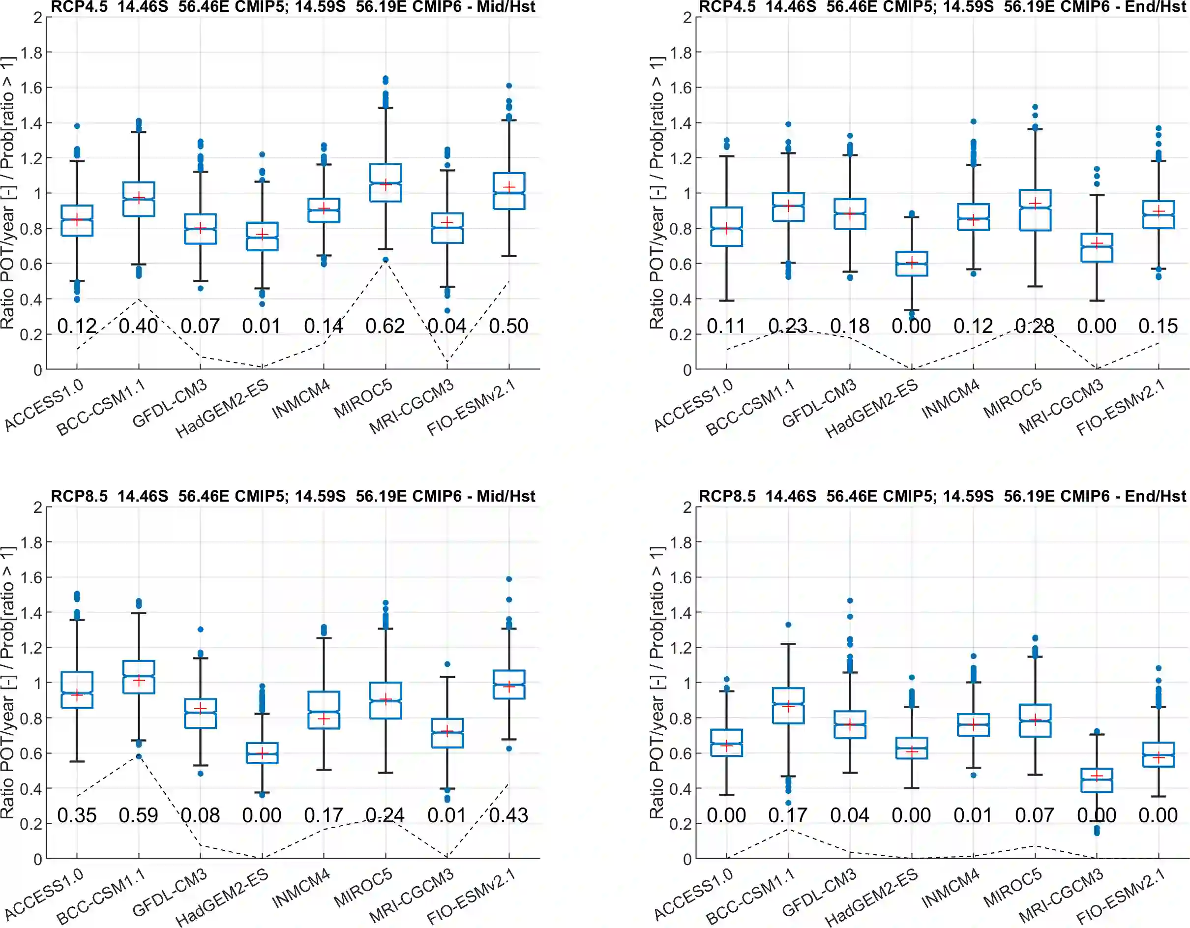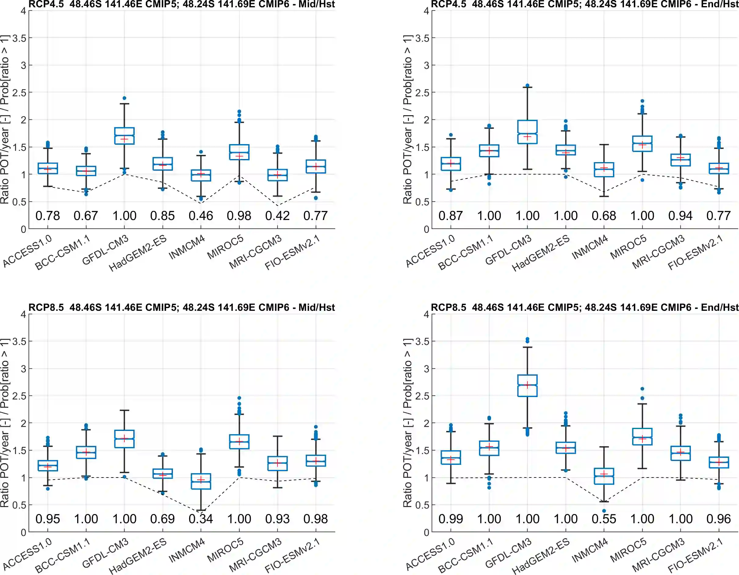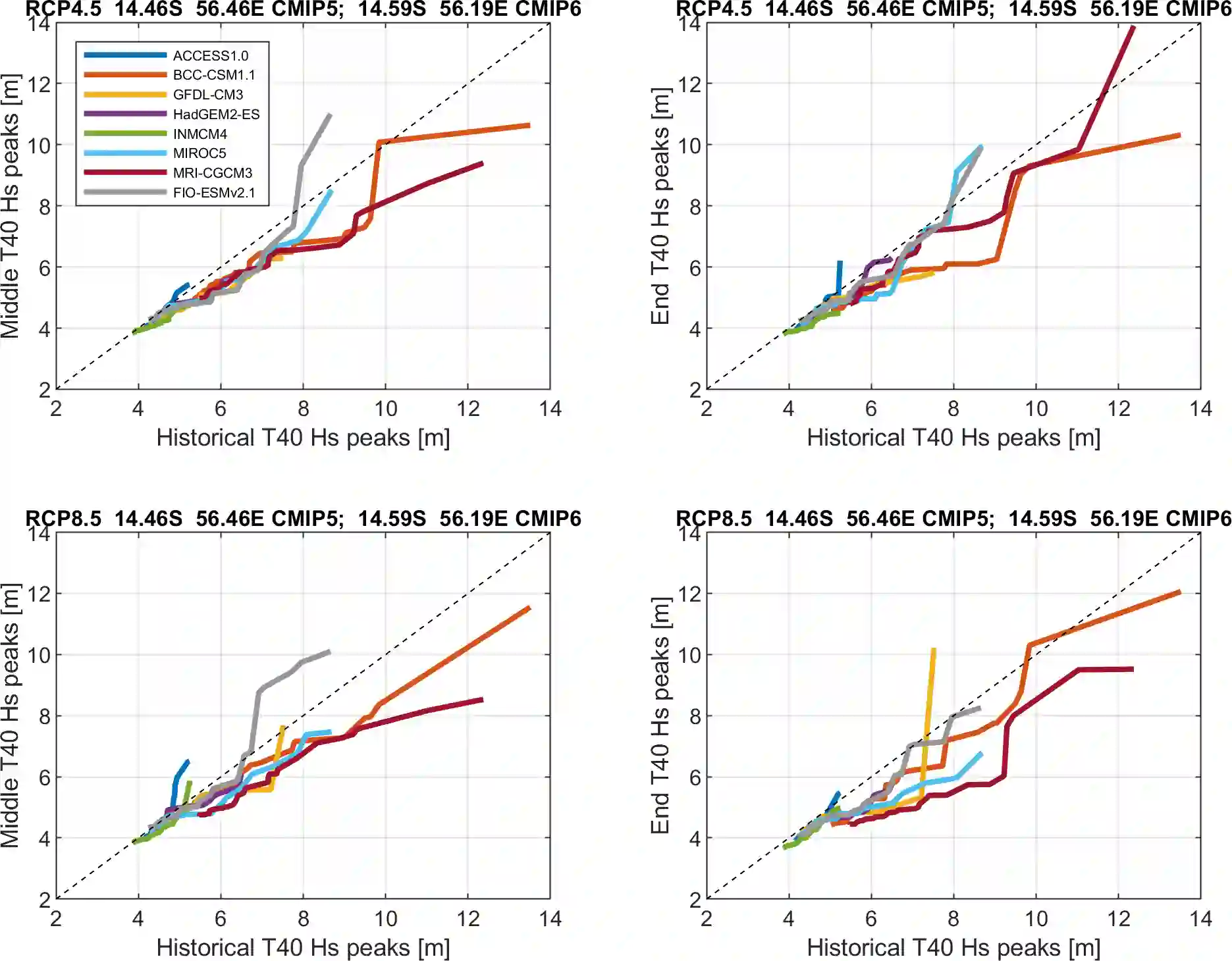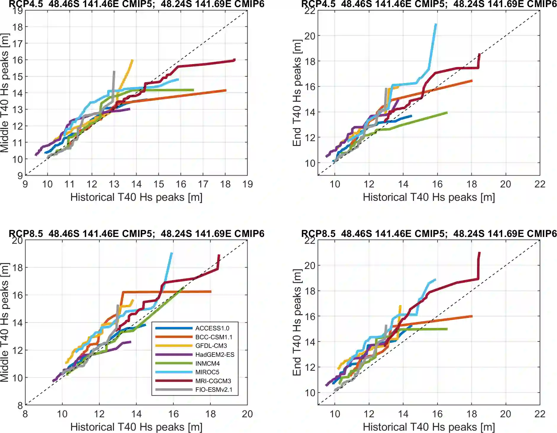 翻译:估计气候对未来海洋风暴严重程度的影响受到巨大的不确定性的困扰,然而,为了安全地设计和运行离岸结构,需要根据现有数据对气候影响作出尽可能最佳的估计。我们探讨长期内重大波高(Hs)100年回报值估计数的变异性,7个具有代表性的CMIP5 GCM和FIO-ESM v2.0 CMIIP6 GCM的WAVEWITCHIII模型产出的变异性,马达加斯加东部和澳大利亚南部各居民区的FIO-ESM v2.0 CMIP6 GCM。但是,利用Bayesian Inference对峰值和区级峰值的不固定极端值分析,提供了作为时间函数的回报值的远值估计;提供了MATLAB软件。不同环流高(GMMS)的回报值估计数和每个居民区的长度和纬度之间有很大差异。这些不确定性的来源往往大于典型的建模选择(例如选择POT的阈值,或BMM的区长长度)。然而,马达加斯加东部的仔细的阈值和块长度是关键,因为那里存在混合的风暴群落人口,所以具有长期的ICP值。