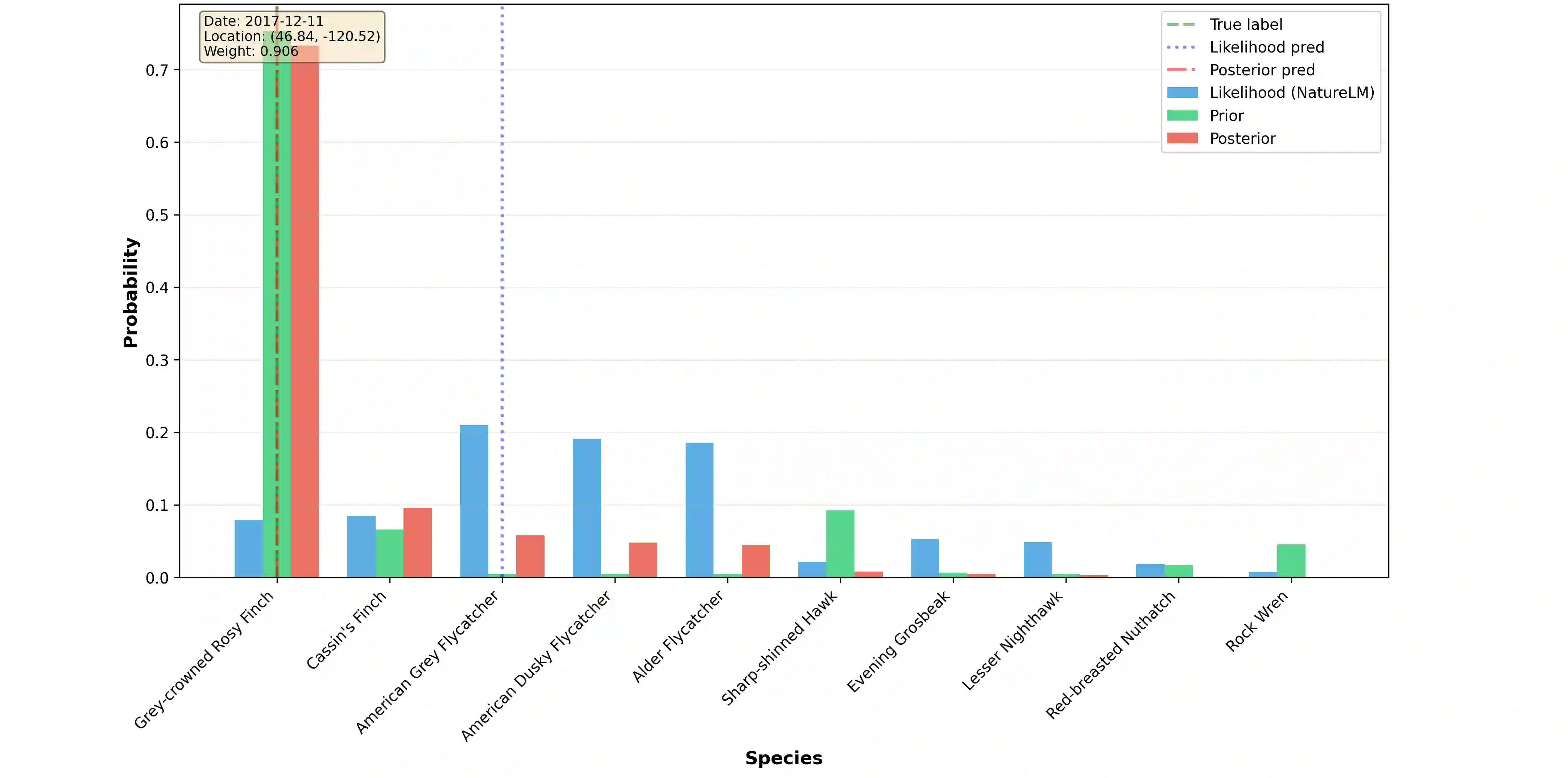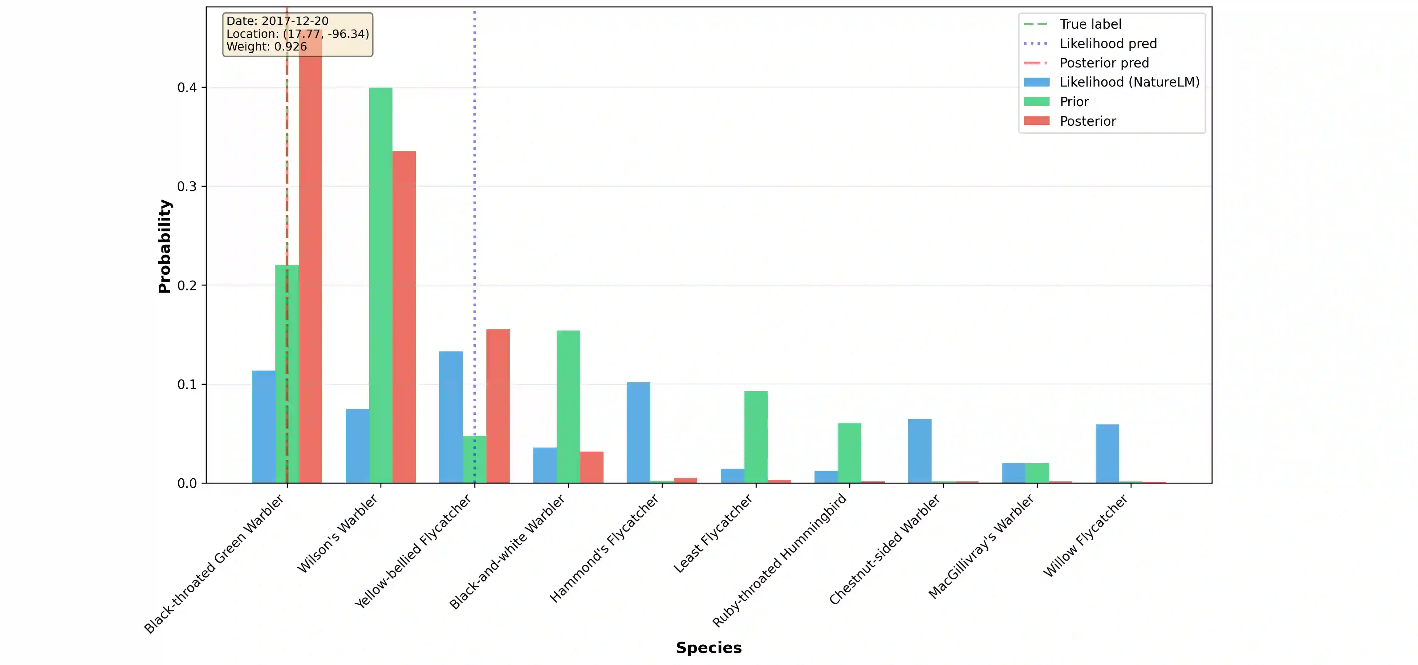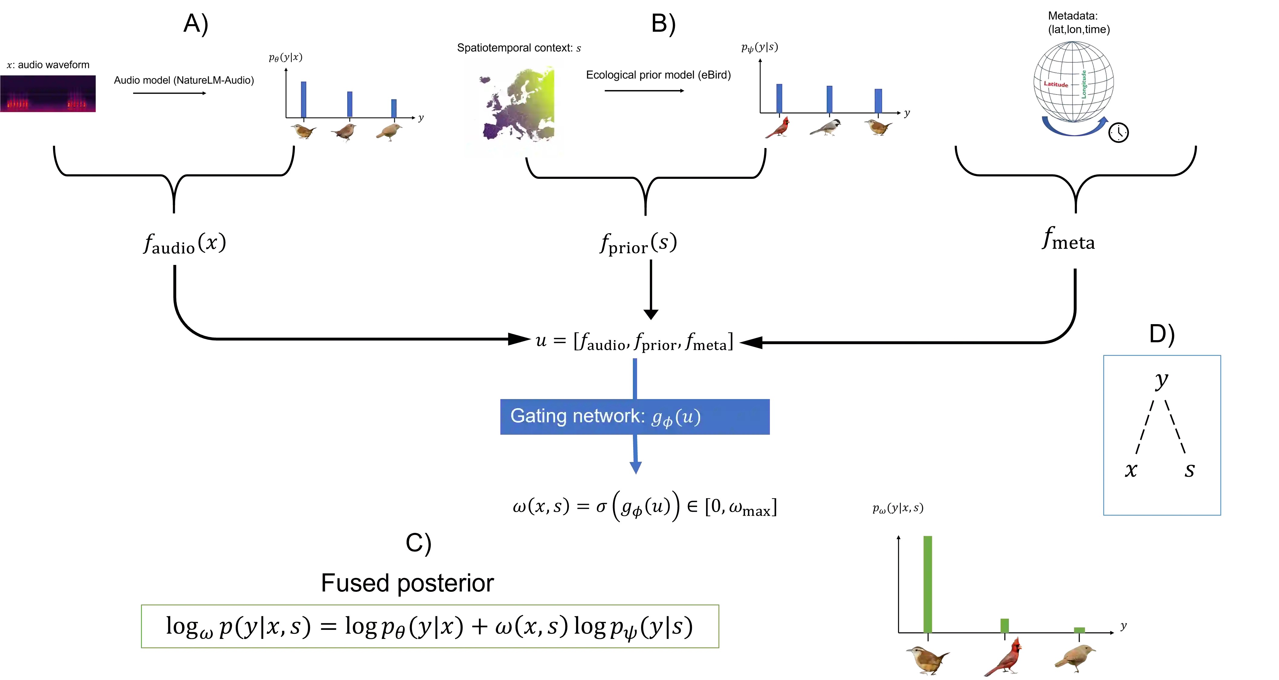 翻译:许多机器学习系统能够获取同一预测目标的多种证据来源,但这些来源在不同输入中的可靠性和信息量往往存在差异。在生物声学分类中,物种身份既可从声学信号推断,也可通过时空上下文(如地理位置和季节)推断;虽然贝叶斯推理支持证据的乘法组合,但在实践中我们通常只能使用判别式预测器而非经过校准的生成模型。本文提出\textbf{F}usion under \textbf{IN}dependent \textbf{C}onditional \textbf{H}ypotheses (\textbf{FINCH})——一种自适应对数线性证据融合框架,该框架将预训练的音频分类器与结构化时空预测器相集成。FINCH通过学习样本级门控函数,从不确定性和信息量统计量中估计上下文信息的可靠性。所得融合族将纯音频分类器作为特例包含其中,并显式约束上下文证据的影响范围,从而形成一个具有可解释纯音频回退机制的风险可控假设类。在多个基准测试中,FINCH始终优于固定权重融合和纯音频基线模型,即使在上下文信息单独作用较弱时仍能提升鲁棒性并改善误差权衡。我们通过轻量化、可解释、基于证据的方法,在CBI数据集上取得了最先进的性能,并在BirdSet的多个子集上获得竞争性或改进的性能。代码已开源:\texttt{\href{https://anonymous.4open.science/r/birdnoise-85CD/README.md}{anonymous-repository}}