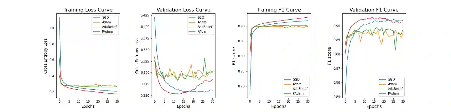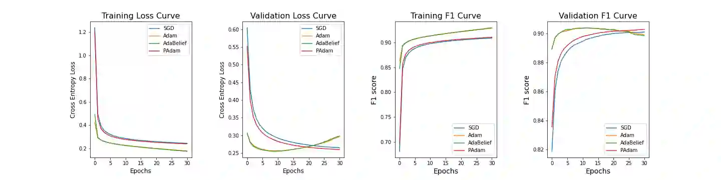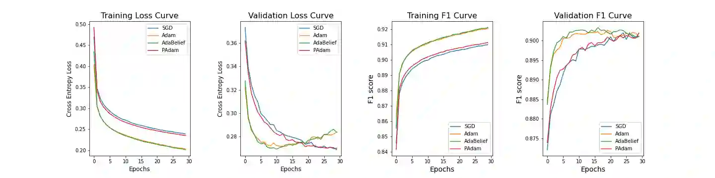 翻译:Adam被广泛应用于神经网络的训练。各种具有不同特点的亚当方法被推出。最近,在社区中引入了两个新的亚当优化器,Adabelief和Padam。我们分析了这两个亚当优化器,并在图像分类的设想中将它们与其他常规优化器(Adam,SGD + Momentum)进行比较。我们评估了AlexNet上的这些优化算法和VGGNet的简化版本以及使用EMNIST数据集的ResNet的性能。 (基准算法可在以下网址查阅:\hyperref[https://github.com/chuyunjun/ProjectCSC413]{https://github.com/chuyunjun/ProjectCSC413})。