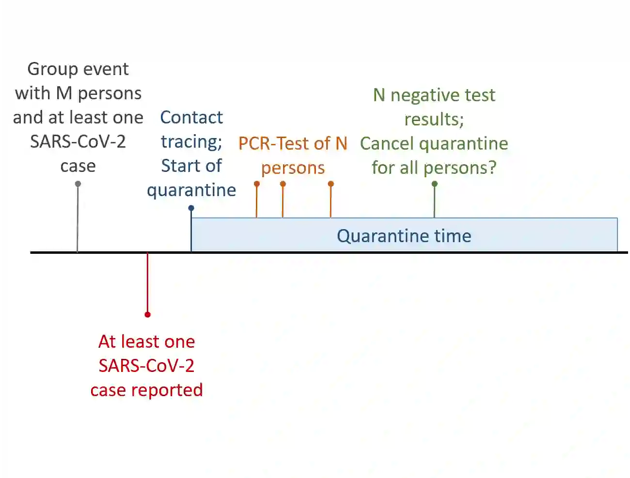In February 2020 the first human infection with SARS-CoV-2 was reported in Germany. Since then the local public health offices have been responsible to monitor and react to the dynamics of the pandemic. One of their major tasks is to contain the spread of the virus after potential spreading events, for example when one or multiple participants have a positive test result after a group meeting (e.g. at school, at a sports event or at work). In this case, contacts of the infected person have to be traced and potentially are quarantined (at home) for a period of time. When all relevant contact persons obtain a negative polymerase chain reaction (PCR) test result, the quarantine may be stopped. However, tracing and testing of all contacts is time-consuming, costly and (thus) not always feasible. This motivates our work, in which we present a statistical model for the probability that no transmission of Sars-CoV-2 occurred given an arbitrary number of test results at potentially different timepoints. Hereby, the time-dependent sensitivity and specificity of the conducted PCR test are taken in account. We employ a parametric Bayesian model which can be adopted to different situations when specific prior knowledge is available. This is illustrated for group events in German school classes and applied to exemplary real-world data from this context. Our approach has the potential to support important quarantine decisions with the goal to achieve a better balance between necessary containment of the pandemic and preservation of social and economic life. The focus of future work should be on further refinement and evaluation of quarantine decisions based on our statistical model.