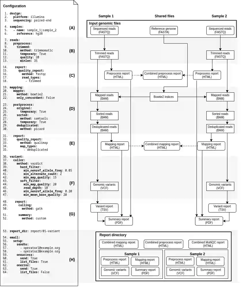 翻译:随着大量平行测序技术的迅速增长,还有更多的实验室正在利用测序DNA碎片进行基因组分析;然而,测序数据的解读在很大程度上取决于生物信息学处理,而生物信息学处理对临床医生和研究人员来说往往要求过高,没有计算背景。另一个问题是,在安装的图书馆和生物信息学工具版本不一致的分离计算中心之间重新复制计算分析。结果:我们提出了一套易于扩展的计算管道,称为 " 蛇线 ",用于处理测序读;包括绘图、组装、变异调用、病毒识别、记录缩写、美格学和甲基化分析。分析的个别步骤,连同方法及其参数,可以很容易地在单一的配置文档中修改。如果管道嵌入虚拟环境中,确保所需资源与主机操作系统隔绝,迅速部署,并复制不同基于Unix平台的分析。结论: " 蛇线 " 是生物信息学分析自动化的强大框架,重点是简单设置、修改、可扩展、可扩展、可扩展、虚拟同步、可复制、虚拟排序框架。