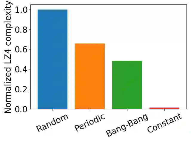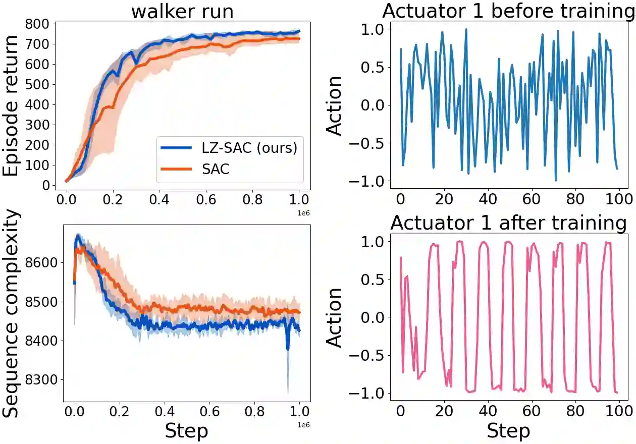 Everything else being equal, simpler models should be preferred over more complex ones. In reinforcement learning (RL), simplicity is typically quantified on an action-by-action basis -- but this timescale ignores temporal regularities, like repetitions, often present in sequential strategies. We therefore propose an RL algorithm that learns to solve tasks with sequences of actions that are compressible. We explore two possible sources of simple action sequences: Sequences that can be learned by autoregressive models, and sequences that are compressible with off-the-shelf data compression algorithms. Distilling these preferences into sequence priors, we derive a novel information-theoretic objective that incentivizes agents to learn policies that maximize rewards while conforming to these priors. We show that the resulting RL algorithm leads to faster learning, and attains higher returns than state-of-the-art model-free approaches in a series of continuous control tasks from the DeepMind Control Suite. These priors also produce a powerful information-regularized agent that is robust to noisy observations and can perform open-loop control.