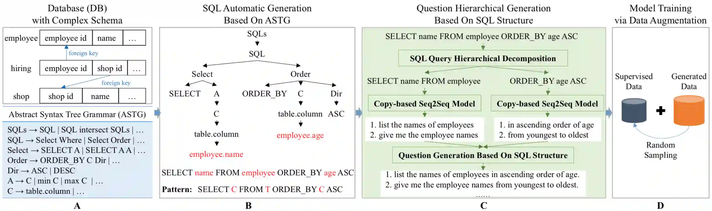 翻译:在深层次的学习时代,数据扩增因其在减轻数据稀少方面的能力而吸引了大量的研究关注。 缺乏用于隐性评估数据库的数据正是跨域文本到 SQL 解析的主要挑战。 以前的工作要么需要人手干预来保证生成数据的质量,要么无法处理复杂的 SQL 查询。 本文提出了一个简单而有效的数据扩增框架。 首先, 根据一个数据库, 我们自动产生大量基于抽象语法树语法的 SQL 查询。 我们要求生成的查询至少涵盖培训数据中至少80%的 SQL 模式, 以便更好地匹配分布。 其次, 我们提出一个等级性 SQL 到问题生成模型, 以获得高质量的自然语言问题, 这是这项工作的主要贡献。 在三个跨域数据集上进行的实验, 即英语的WikisQL 和蜘蛛 以及中文的 DusQL, 表明我们提出的数据扩增框架可以不断提高强基线的性能, 特别是等级生成模型是改进的关键。