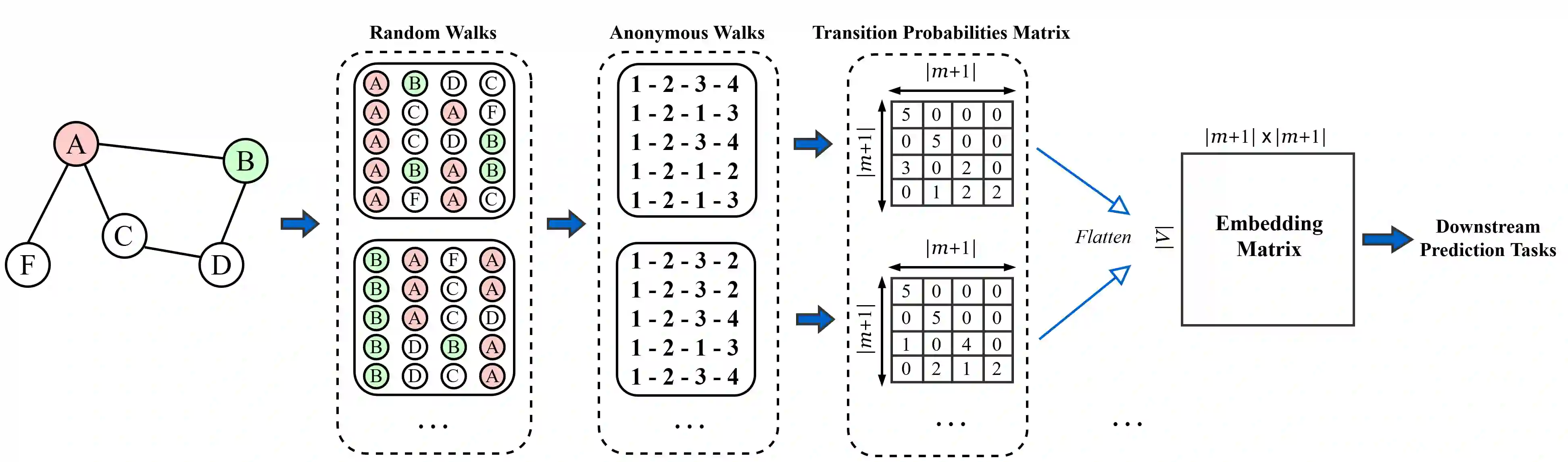 Recent advances in complex network analysis opened a wide range of possibilities for applications in diverse fields. The power of the network analysis depends on the node features. The topology-based node features are realizations of local and global spatial relations and node connectivity structure. Hence, collecting correct information on the node characteristics and the connectivity structure of the neighboring nodes plays the most prominent role in node classification and link prediction in complex network analysis. The present work introduces a new feature abstraction method, namely the Transition Probabilities Matrix (TPM), based on embedding anonymous random walks on feature vectors. The node feature vectors consist of transition probabilities obtained from sets of walks in a predefined radius. The transition probabilities are directly related to the local connectivity structure, hence correctly embedded onto feature vectors. The success of the proposed embedding method is tested on node identification/classification and link prediction on three commonly used real-world networks. In real-world networks, nodes with similar connectivity structures are common; Thus, obtaining information from similar networks for predictions on the new networks is the distinguishing characteristic that makes the proposed algorithm superior to the state-of-the-art algorithms in terms of cross-networks generalization tasks.