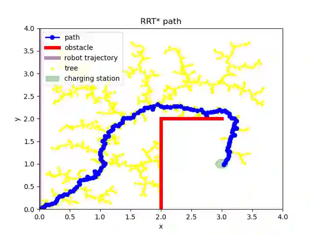 Mobile robots often have limited battery life and need to recharge periodically. This paper presents an RRT- based path-planning algorithm that addresses battery power management. A path is generated continuously from the robot's current position to its recharging station. The robot decides if a recharge is needed based on the energy required to travel on that path and the robot's current power. RRT* is used to generate the first path, and then subsequent paths are made using information from previous trees. Finally, the presented algorithm was compared with Extended Rate Random Tree (ERRT) algorithm