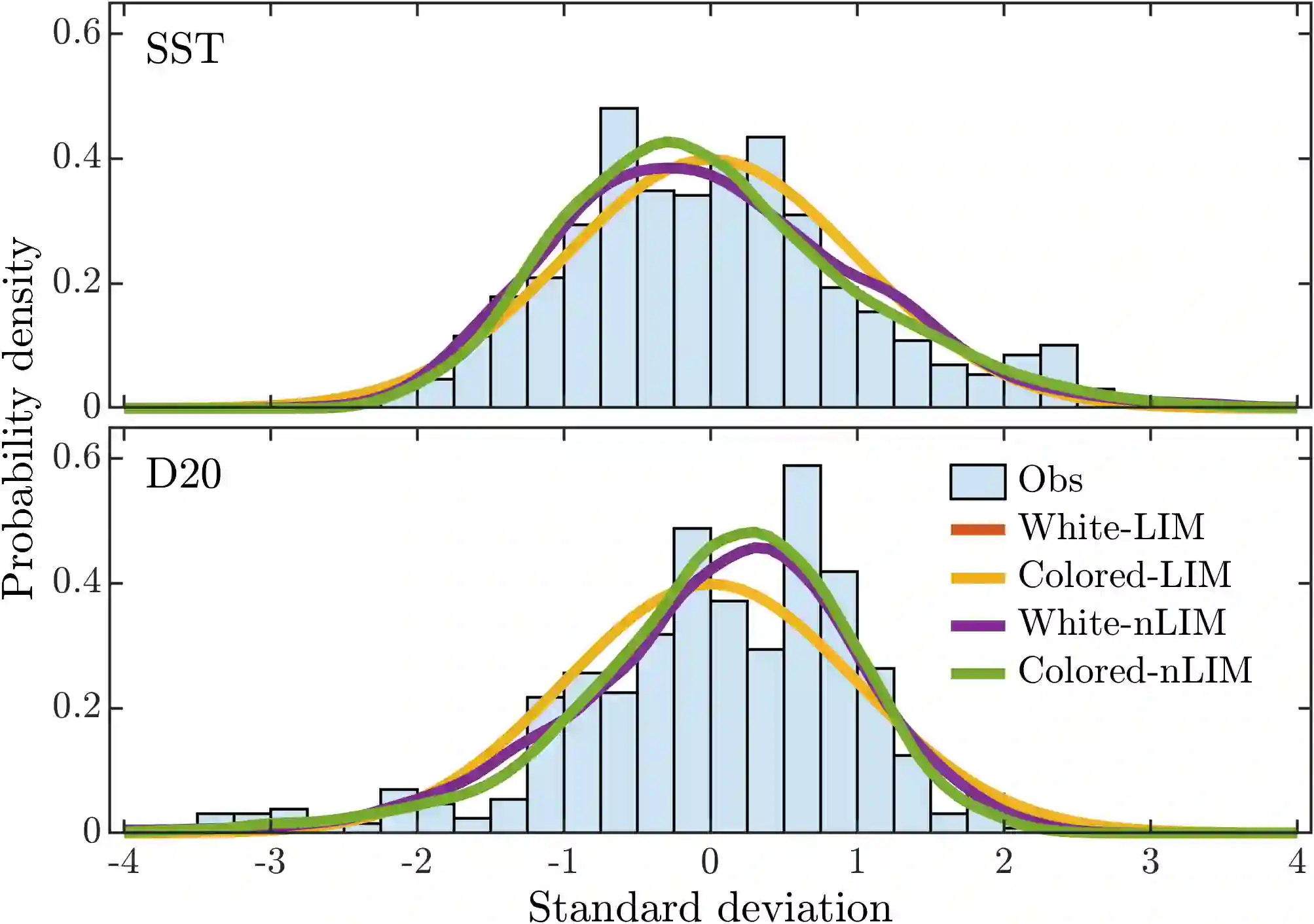 翻译:线性逆模型(LIM)是一类数据驱动方法,通过构建近似线性随机模型来表示复杂的观测数据。其随机强迫项可采用高斯白噪声或Ornstein-Uhlenbeck有色噪声进行建模,对应的模型分别称为White-LIM与Colored-LIM。尽管LIM在气候科学中应用广泛,但其本质是将观测分布近似为高斯分布,这限制了模型捕捉非对称特征的能力。本研究将LIM拓展至非线性动力学框架,提出了White-nLIM与Colored-nLIM,能够以更灵活、更精确的方式从观测数据中表征复杂动力学行为。所提出的方法不仅考虑了底层系统的非线性特性,还能有效捕捉观测分布的偏态特征。此外,我们将这些方法应用于ENSO的低维表征,并证明White-nLIM与Colored-nLIM均能成功捕捉其非线性特征。