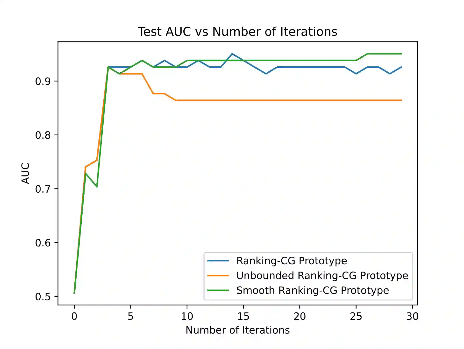 The most popular classification algorithms are designed to maximize classification accuracy during training. However, this strategy may fail in the presence of class imbalance since it is possible to train models with high accuracy by overfitting to the majority class. On the other hand, the Area Under the Curve (AUC) is a widely used metric to compare classification performance of different algorithms when there is a class imbalance, and various approaches focusing on the direct optimization of this metric during training have been proposed. Among them, SVM-based formulations are especially popular as this formulation allows incorporating different regularization strategies easily. In this work, we develop a prototype learning approach that relies on cutting-plane method, similar to Ranking SVM, to maximize AUC. Our algorithm learns simpler models by iteratively introducing cutting planes, thus overfitting is prevented in an unconventional way. Furthermore, it penalizes the changes in the weights at each iteration to avoid large jumps that might be observed in the test performance, thus facilitating a smooth learning process. Based on the experiments conducted on 73 binary classification datasets, our method yields the best test AUC in 25 datasets among its relevant competitors.