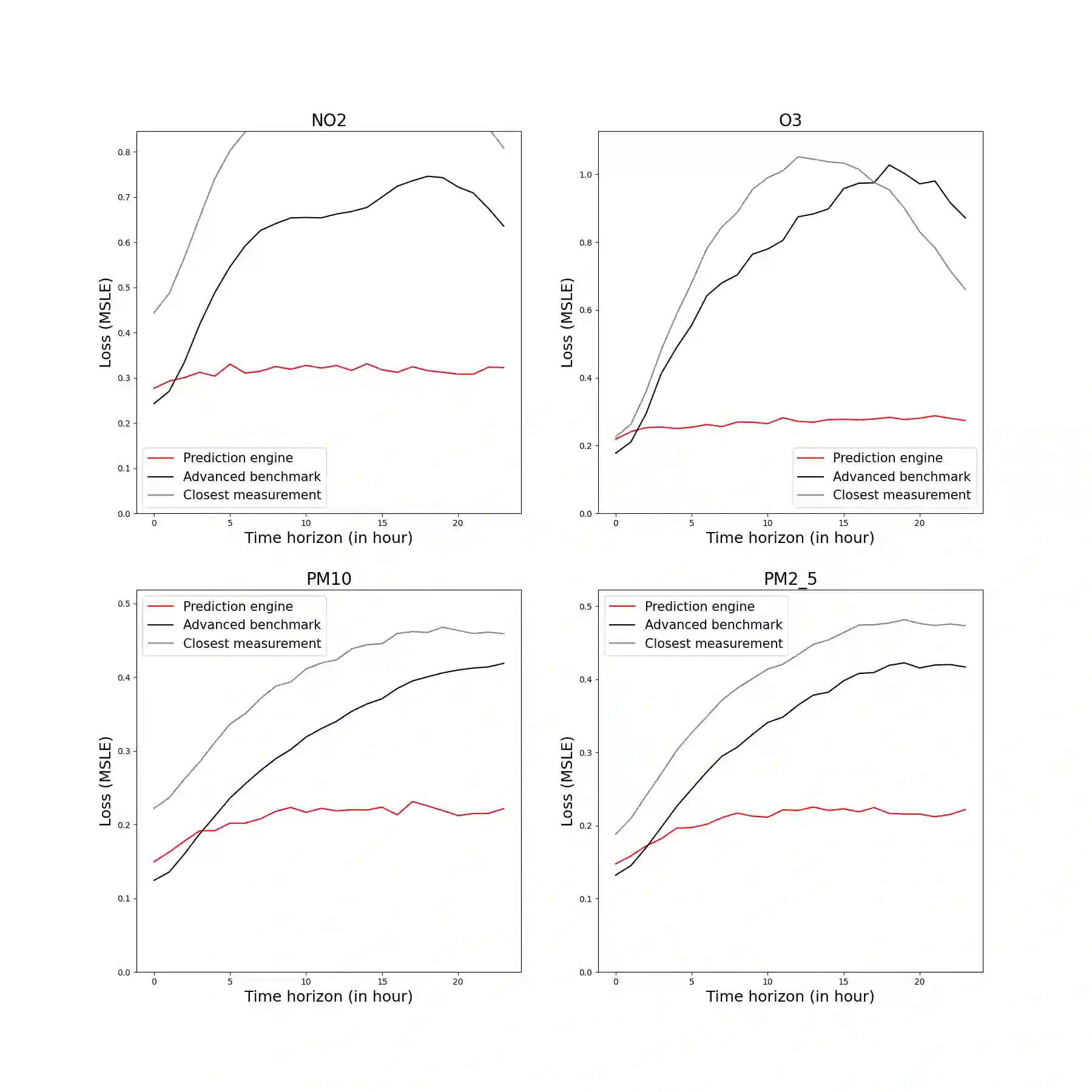 翻译:本文提供了一个能够共同预测损害人们健康的主要污染物浓度的引擎:二氧化氮(NO2)、臭氧(O3)和颗粒物质(PM2.5和PM10,分别是直径分别低于2.5m和10um的粒子)。发动机用空气质量监测站的测量、天气预报、物理模型产出和交通估计来提供24小时的预报。预测是用几个空间分辨率制作的,从几十米到几十公里不等,与需要空气质量数据的几种使用案例相匹配。我们引入了规模单位区块,它能够无缝地整合在给定的分辨率上的所有可用投入,以返回同一分辨率上的预报。然后,发动机以一个U-Net结构为基础,与几个这些块一起建造,使其有能力处理投入和在不同分辨率上的产出预测。我们实施并评价了欧洲和美国最大城市的发动机,这显然比其他预测方法要差得多。特别是,外表准确度仍然很高,这意味着发动机可以在一个特定分辨率的决议中使用无缝的完整的所有材料。 发动机可以很快在某个城市里程中使用,通常不包含质量的模型。