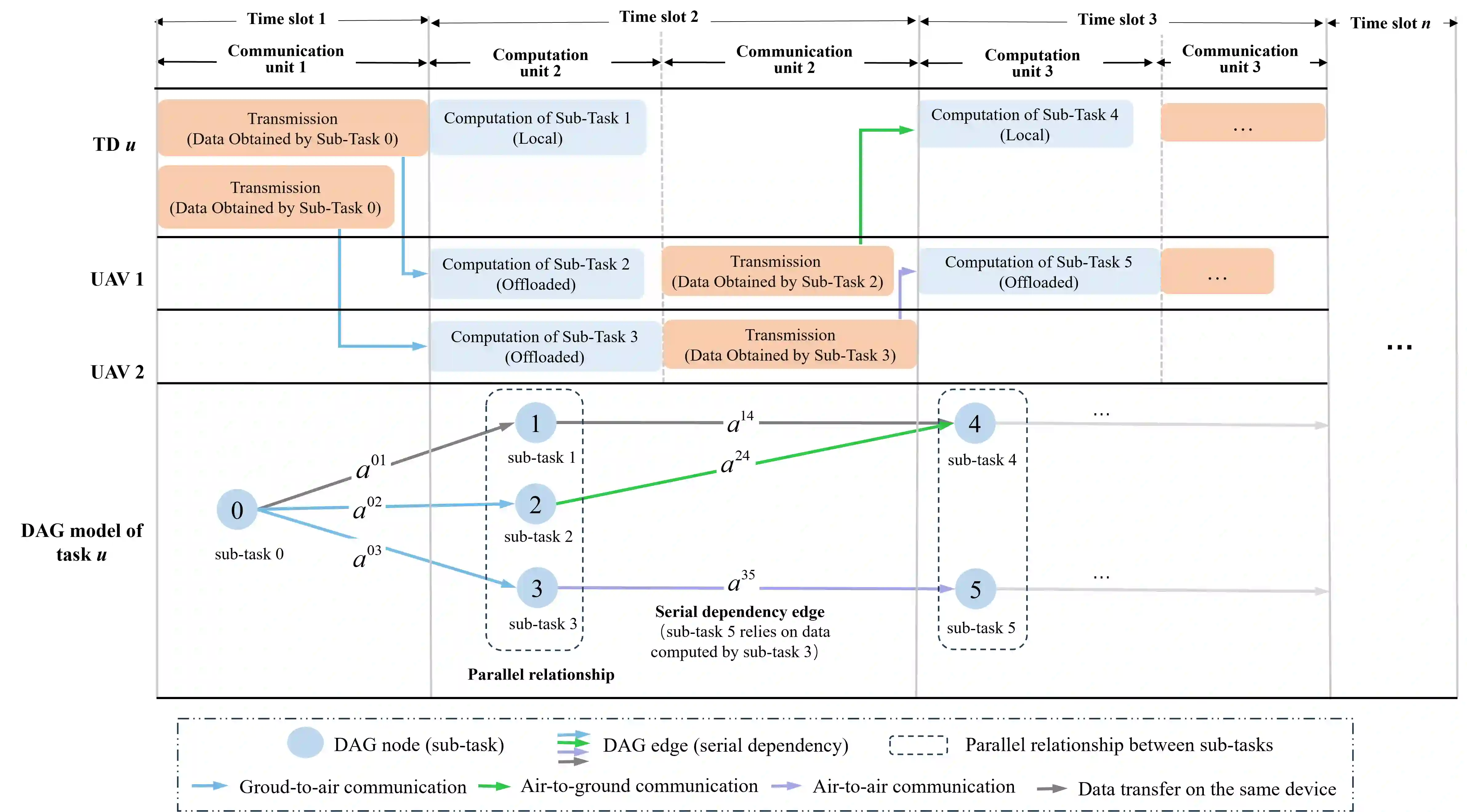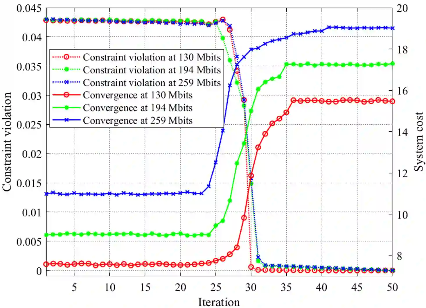 翻译:本文提出了一种新颖的多无人机辅助协作移动边缘计算框架,其中终端设备的计算任务可被分解为串行或并行子任务,并卸载至协作无人机群。我们首先将所有子任务间的依赖关系建模为有向无环图,并设计了一种双时间尺度帧结构以解耦子任务间的相互依赖关系,从而进行子任务调度。随后,构建了一个联合子任务卸载、计算资源分配与无人机轨迹优化的优化问题,其目标是最小化系统成本,即任务完成延迟与系统能耗的加权和。为解决这一非凸混合整数非线性规划问题,本文开发了一种惩罚对偶分解与逐次凸逼近算法。具体而言,基于惩罚对偶分解理论,原始混合整数非线性规划问题被等价转化为连续形式。通过将所得问题解耦为三个嵌套子问题,进一步结合逐次凸逼近方法重构非凸部分并获得理想解。数值结果表明:1) 与基准算法相比,所提方案能显著降低系统成本,从而在任务延迟与能耗之间实现更优的权衡;2) 所提算法能够在多无人机间实现分布式计算的高效负载均衡。