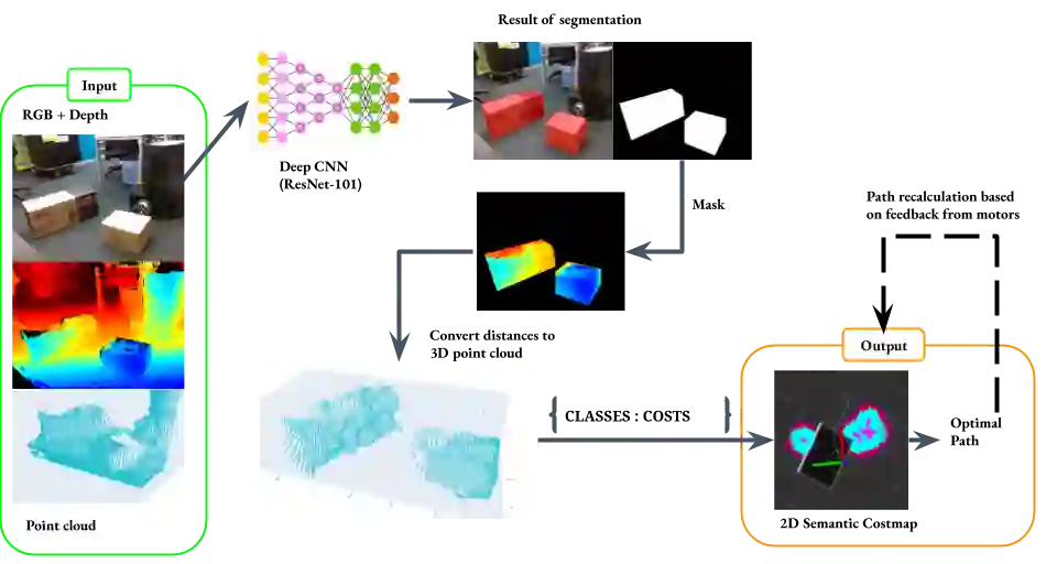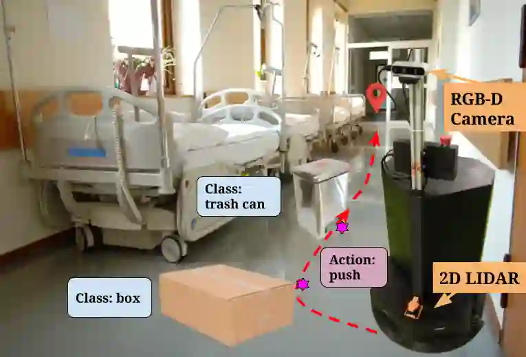 In this paper, we propose a novel approach to wheeled robot navigation through an environment with movable obstacles. A robot exploits knowledge about different obstacle classes and selects the minimally invasive action to perform to clear the path. We trained a convolutional neural network (CNN), so the robot can classify an RGB-D image and decide whether to push a blocking object and which force to apply. After known objects are segmented, they are being projected to a cost-map, and a robot calculates an optimal path to the goal. If the blocking objects are allowed to be moved, a robot drives through them while pushing them away. We implemented our algorithm in ROS, and an extensive set of simulations showed that the robot successfully overcomes the blocked regions. Our approach allows a robot to successfully build a path through regions, where it would have stuck with traditional path-planning techniques.