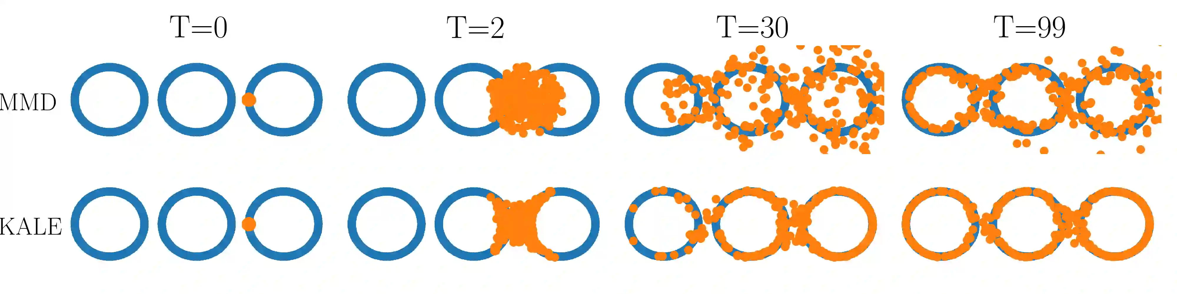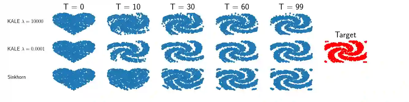 翻译:我们研究梯度流,以轻松接近移动源和固定目标分布之间的 Kullack- Leiber (KL) 移动源和固定目标分布之间的差值。 这个近值, 称为 KALE (KL 近似下下限估计值), 解决了Fenchel 双重问题的常规版本, 定义了功能等级的 KL。 当使用复制的 Kernel Hilbert 空间( RKHS) 来定义函数等级时, 我们显示 KALE 持续在 KLE 和 最大偏差( MMD) 之间进行交叉。 和 MMMD 和其他 综合概率分布模型一样, KALE 仍然被很好地定义为相异分布 。 尽管如此, KALE 相对于 MMD 来说, KLE, KLE 会继承限制 KLE 的对支持分布支持不匹配的敏感度。 这两个属性使得 KALE 梯度流在目标分布在低维方时特别适合。 在假设 KLE 轨迹足够平稳的情况下, 我们展示 KALE 流的全球趋同 。 我们提议从源和目标分布如何验证。