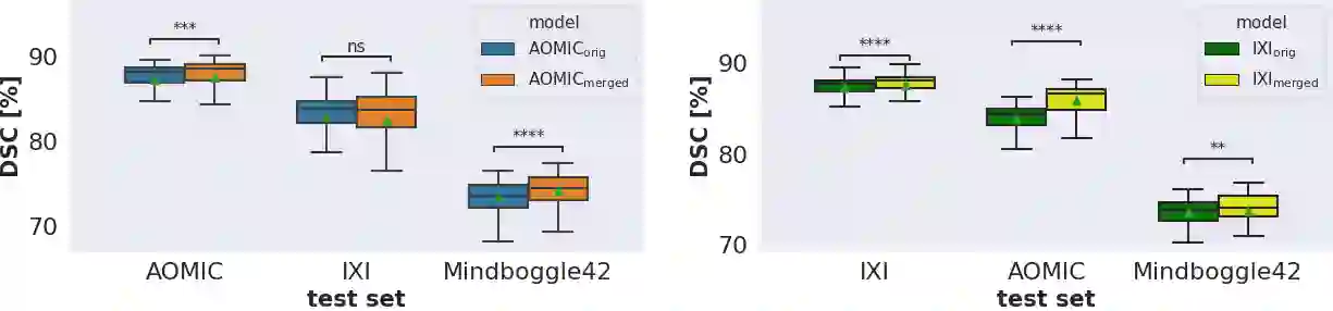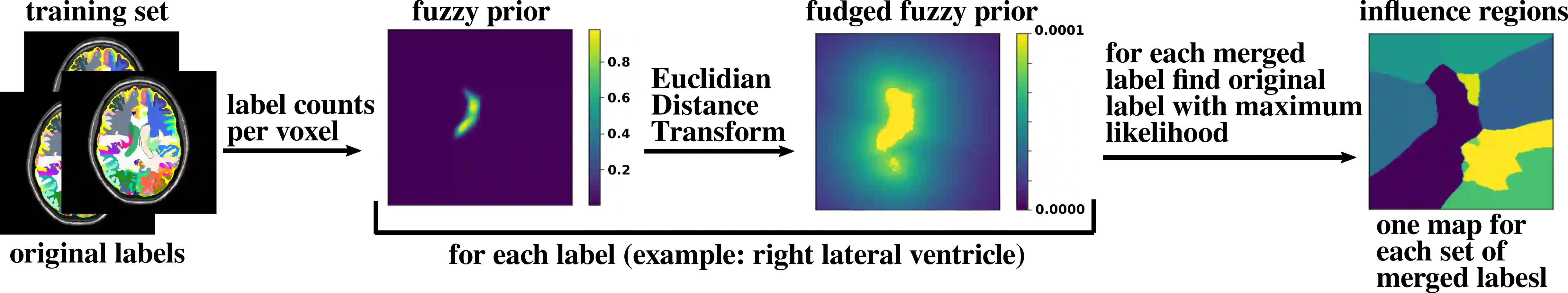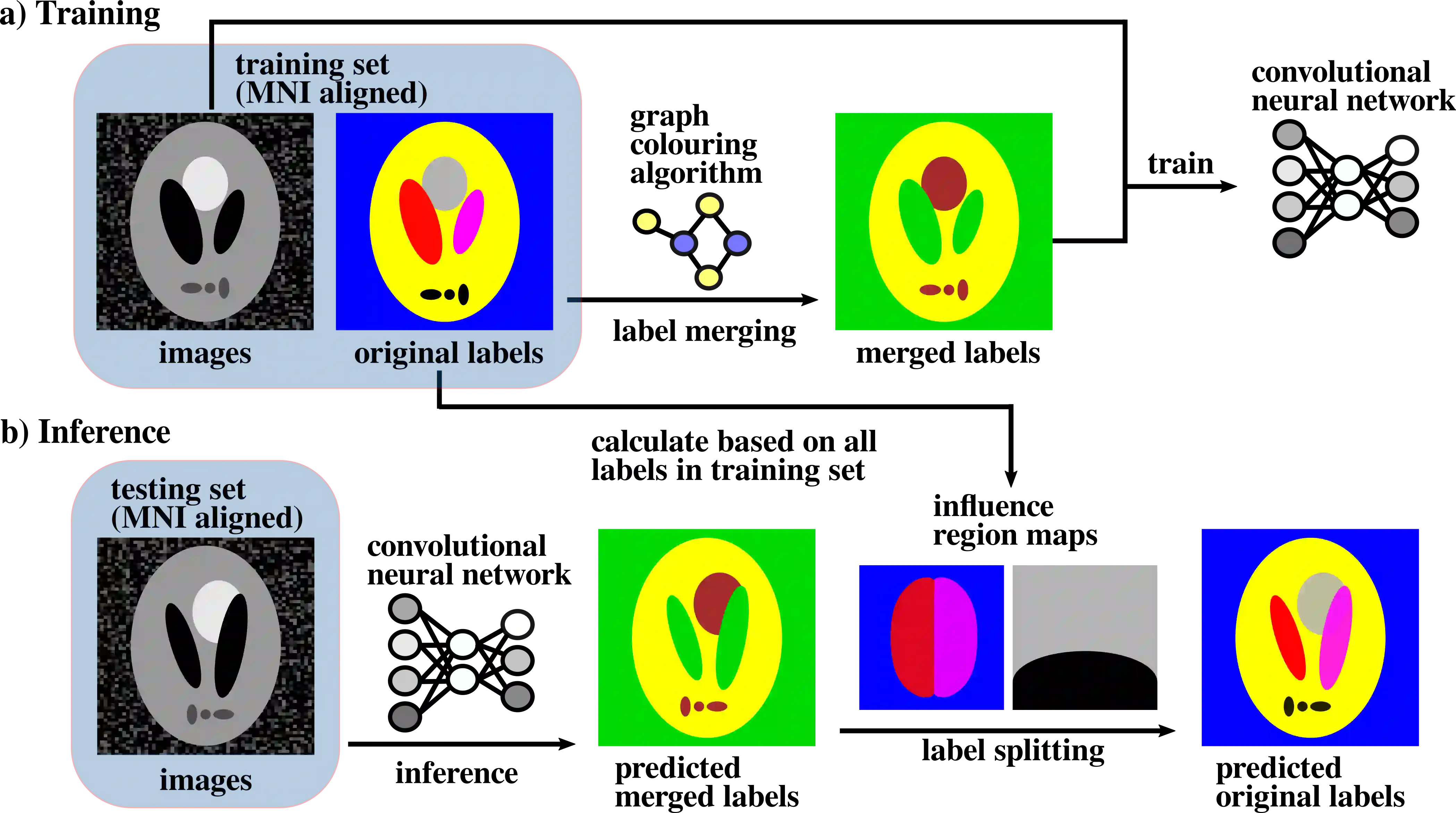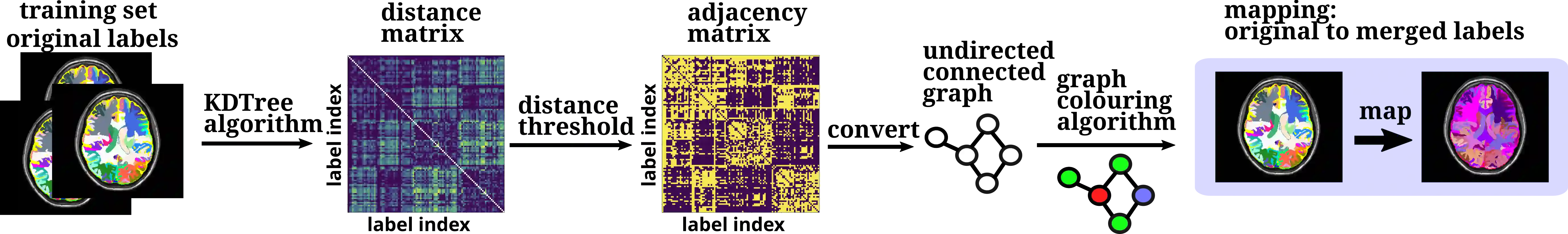 Whole brain parcellation requires inferring hundreds of segmentation labels in large image volumes and thus presents significant practical challenges for deep learning approaches. We introduce label merge-and-split, a method that first greatly reduces the effective number of labels required for learning-based whole brain parcellation and then recovers original labels. Using a greedy graph colouring algorithm, our method automatically groups and merges multiple spatially separate labels prior to model training and inference. The merged labels may be semantically unrelated. A deep learning model is trained to predict merged labels. At inference time, original labels are restored using atlas-based influence regions. In our experiments, the proposed approach reduces the number of labels by up to 68% while achieving segmentation accuracy comparable to the baseline method without label merging and splitting. Moreover, model training and inference times as well as GPU memory requirements were reduced significantly. The proposed method can be applied to all semantic segmentation tasks with a large number of spatially separate classes within an atlas-based prior.