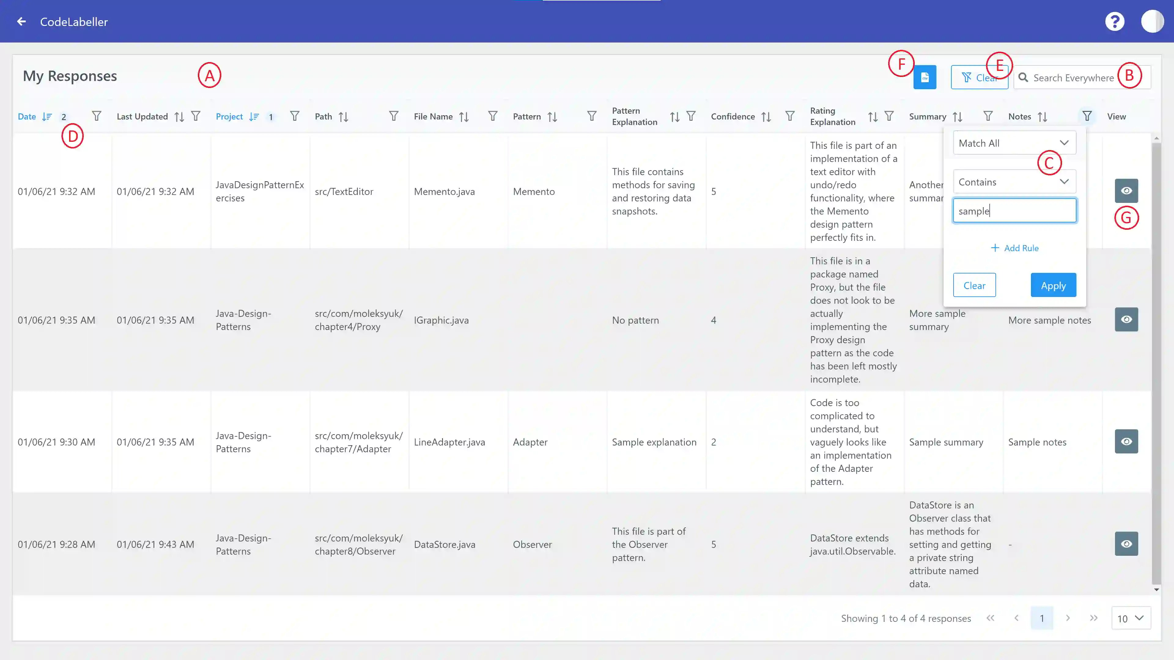 The appropriate use of design patterns in code is a vital measurement of good software quality in object-oriented software applications. There exist tools to detect design pattern usage in Java source files, where their detection mechanisms have been honed through the use of supervised machine learning techniques that require large datasets of labelled files. However, manually labelling these files leads to issues such as tediousness if the team of labellers is small, and conflicting opinions between labellers, if large. Thus, we present CodeLabeller, a web-based tool which aims to provide a more efficient approach in handling the process of labelling Java source files at scale by improving the data collection process throughout, and improving the degree of reliability of responses by requiring each labeller to attach a confidence rating to each of their responses. We test CodeLabeller by constructing a corpus of over a thousand source files obtained from a large collection of open-source Java projects, and labelling each Java source file with their respective design patterns (if any), and summaries. This paper discusses the motivation behind thecreation of CodeLabeller, a demonstration of the tool and its UI, its implementation, benefits and lastly, some ideas for future improvements. A demo version of CodeLabeller can be found at: https://codelabeller.org.