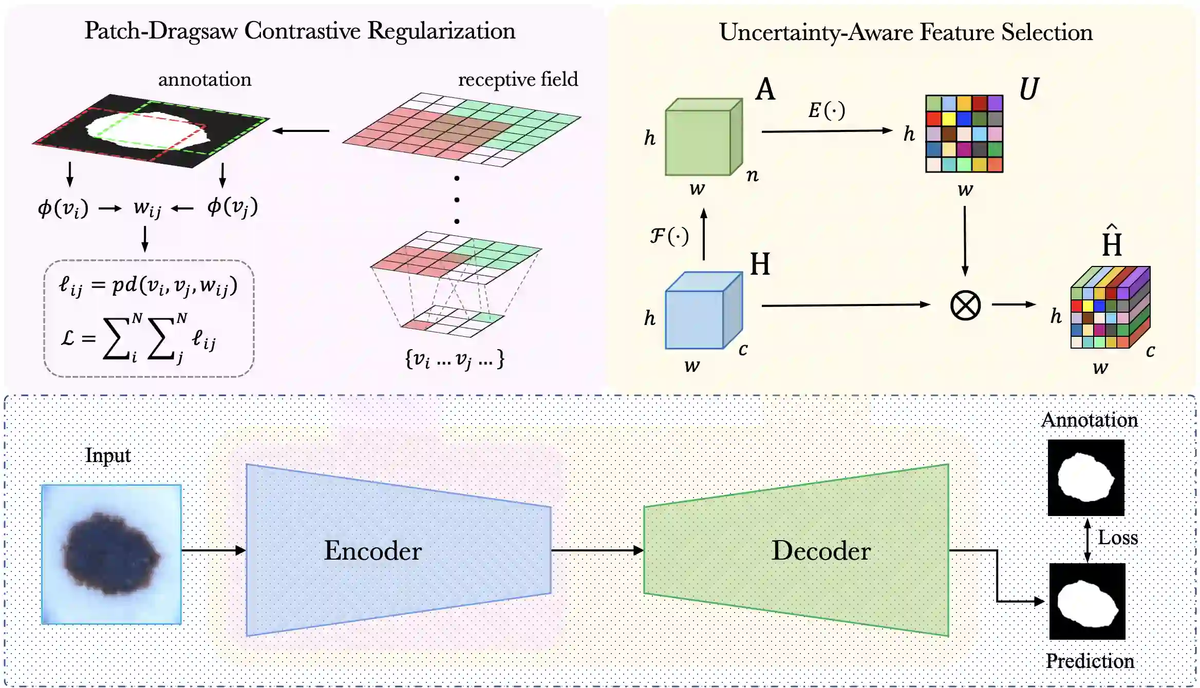 Medical image segmentation has been widely recognized as a pivot procedure for clinical diagnosis, analysis, and treatment planning. However, the laborious and expensive annotation process lags down the speed of further advances. Contrastive learning-based weight pre-training provides an alternative by leveraging unlabeled data to learn a good representation. In this paper, we investigate how contrastive learning benefits the general supervised medical segmentation tasks. To this end, patch-dragsaw contrastive regularization (PDCR) is proposed to perform patch-level tugging and repulsing with the extent controlled by a continuous affinity score. And a new structure dubbed uncertainty-aware feature selection block (UAFS) is designed to perform the feature selection process, which can handle the learning target shift caused by minority features with high uncertainty. By plugging the proposed 2 modules into the existing segmentation architecture, we achieve state-of-the-art results across 8 public datasets from 6 domains. Newly designed modules further decrease the amount of training data to a quarter while achieving comparable, if not better, performances. From this perspective, we take the opposite direction of the original self/un-supervised contrastive learning by further excavating information contained within the label.