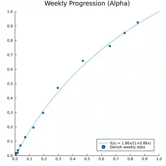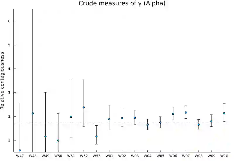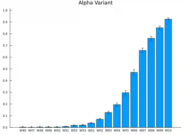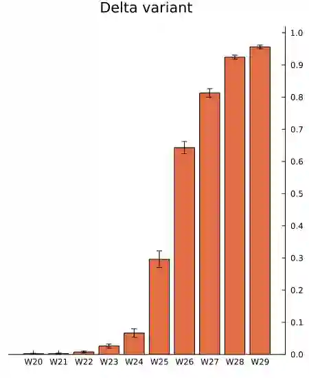 翻译:我们提出一个简单的动态模型来估计两种病毒变异的相对传染性。最大可能性估计和推论在抽样期内容易改变病例总数,并可以作为一种后勤倒退来表示。我们利用丹麦周报数据估计SARS-COV-2的阿尔法变体,以将复制数比祖传变体增加1.51倍[CI 95%:1.50,1.53]。三角洲变体将复制数比阿尔法变异体增加2.17倍[CI :1.99, 2.36],比祖传变体增加3.28倍[CI:95%,3.01,3.58]。预测新出现的病毒变异体的比例是直接向前的,我们继续显示如何在没有当代顺序结果的情况下估计新变异体的有效复制数。这对实时评估该大流行病的状况很有帮助,因为我们用阿尔法变体的推断有效复制数来进行实验性说明。