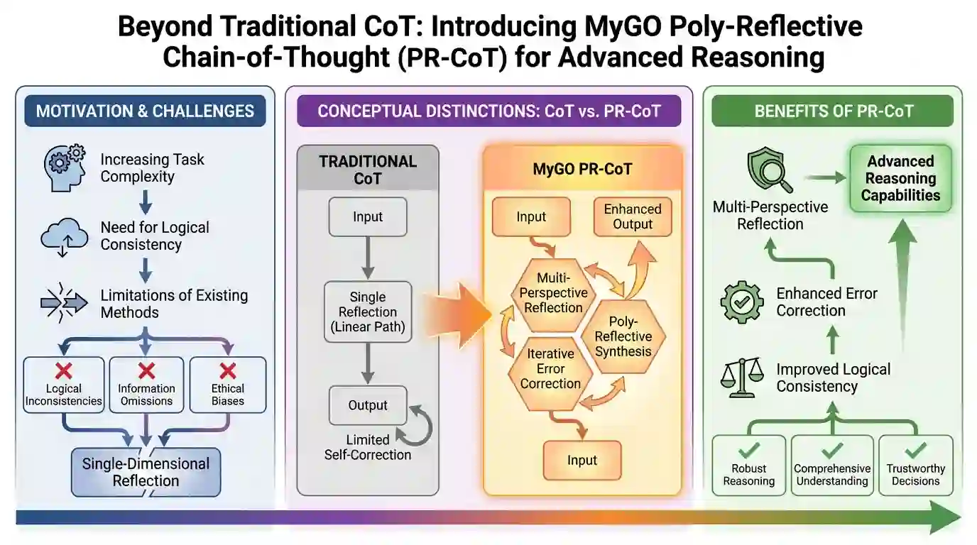 翻译:尽管思维链(CoT)提示技术推动了大型语言模型(LLM)的推理能力,但在处理复杂或涉及伦理敏感性的任务时,其一致性、准确性和自校正方面仍存在挑战。现有的单维度反思方法改进效果有限。本文提出MyGO多视角反思思维链(PR-CoT),这是一种采用结构化多视角反思的新方法。在初始CoT推理后,PR-CoT引导LLM从多个预定义维度对自身推理进行自我评估:逻辑一致性、信息完整性、偏见/伦理考量以及替代解决方案。该方法完全通过提示工程实现,无需重新训练模型即可将初始CoT优化为更稳健、更准确的最终答案。在算术、常识推理、伦理决策和逻辑谜题等任务上,使用GPT-3.5和GPT-4模型的实验表明,PR-CoT具有卓越性能。其在逻辑一致性和错误校正方面显著优于传统CoT及现有反思方法,在伦理决策等复杂领域提升尤为显著。消融实验、人工评估和定性分析进一步验证了各反思维度的贡献,以及我们提出的多视角反思范式在提升LLM推理可靠性方面的整体有效性。