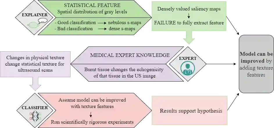 Approximately 1.25 million people in the United States are treated each year for burn injuries. Precise burn injury classification is an important aspect of the medical AI field. In this work, we propose an explainable human-in-the-loop framework for improving burn ultrasound classification models. Our framework leverages an explanation system based on the LIME classification explainer to corroborate and integrate a burn expert's knowledge -- suggesting new features and ensuring the validity of the model. Using this framework, we discover that B-mode ultrasound classifiers can be enhanced by supplying textural features. More specifically, we confirm that texture features based on the Gray Level Co-occurance Matrix (GLCM) of ultrasound frames can increase the accuracy of transfer learned burn depth classifiers. We test our hypothesis on real data from porcine subjects. We show improvements in the accuracy of burn depth classification -- from ~88% to ~94% -- once modified according to our framework.