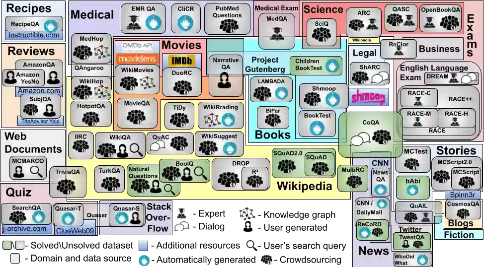 翻译:本文调查了60个英文机器阅读理解数据集,目的是为关注这一问题的其他研究人员提供方便的资源。 我们根据数据集的问答形式进行分类,并在各层面进行比较,包括大小、词汇、数据来源、创建方法、人类性能水平和第一个问题词。 我们的分析显示维基百科是迄今为止最常见的数据源,相对缺乏为什么、何时、在哪里跨数据集的问题。