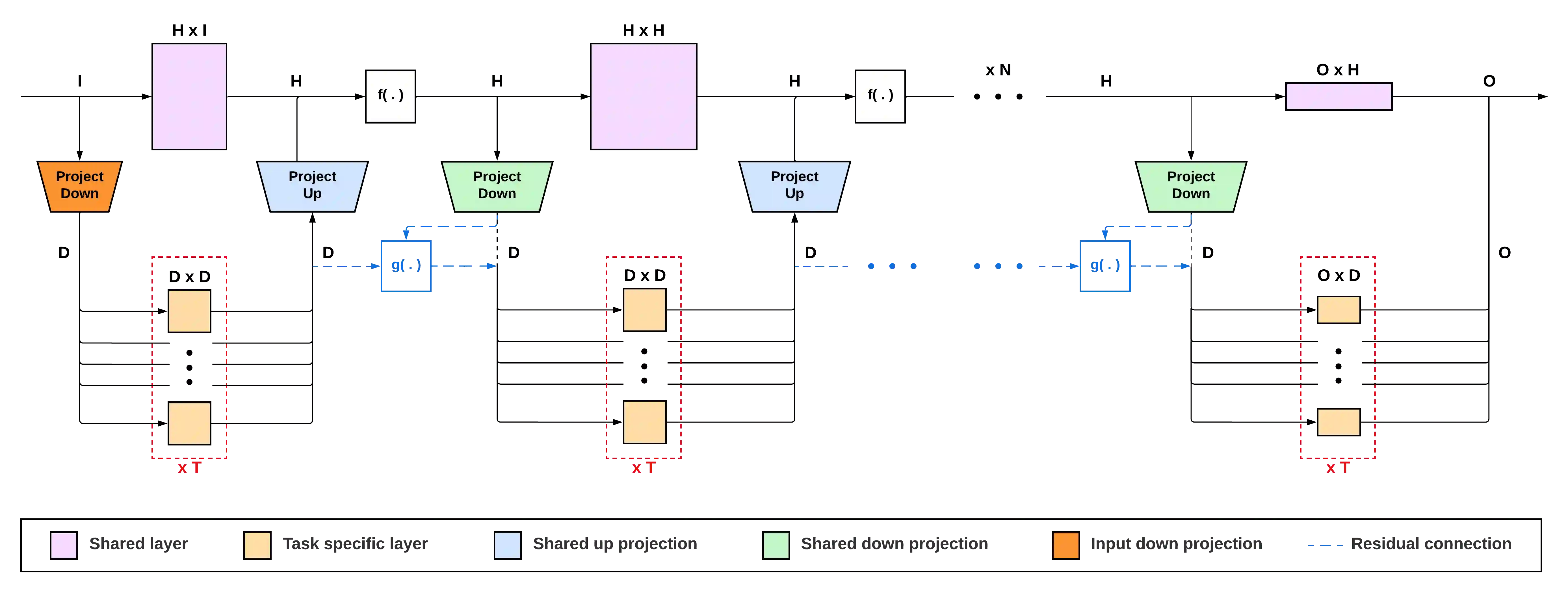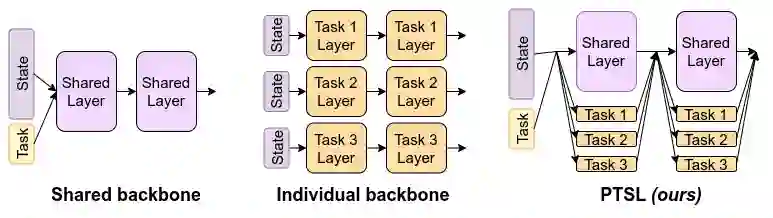 Multi-task reinforcement learning could enable robots to scale across a wide variety of manipulation tasks in homes and workplaces. However, generalizing from one task to another and mitigating negative task interference still remains a challenge. Addressing this challenge by successfully sharing information across tasks will depend on how well the structure underlying the tasks is captured. In this work, we introduce our new architecture, Projected Task-Specific Layers (PTSL), that leverages a common policy with dense task-specific corrections through task-specific layers to better express shared and variable task information. We then show that our model outperforms the state of the art on the MT10 and MT50 benchmarks of Meta-World consisting of 10 and 50 goal-conditioned tasks for a Sawyer arm.