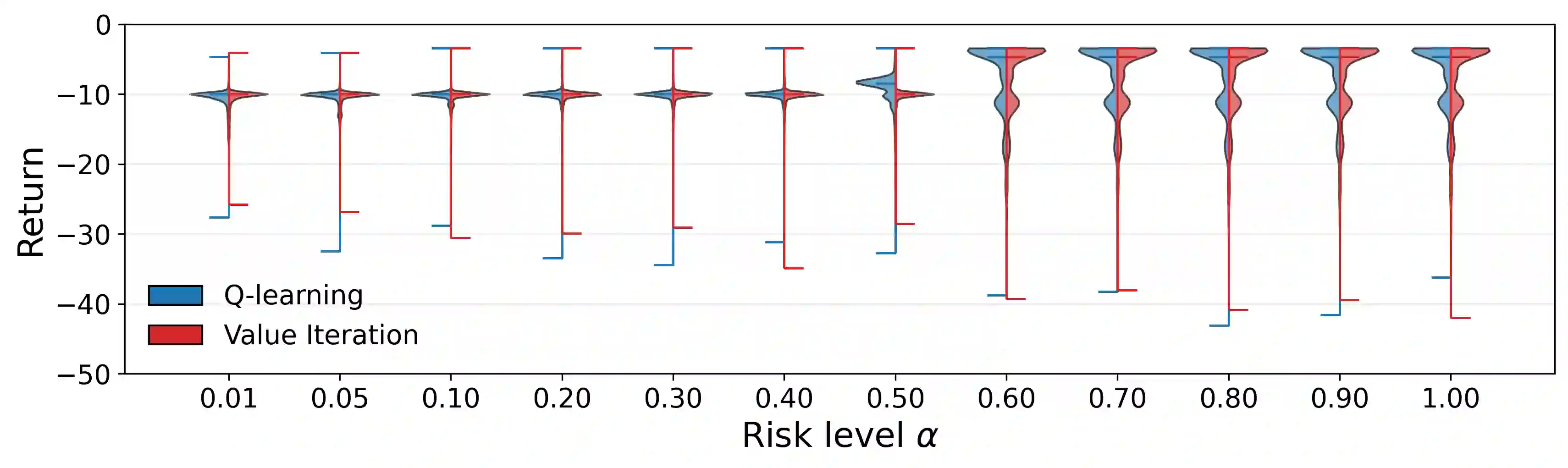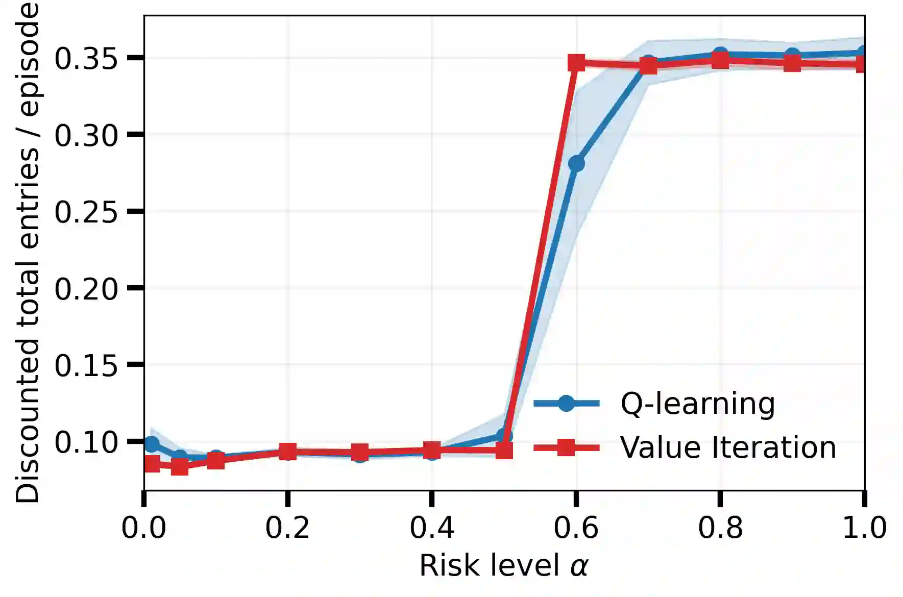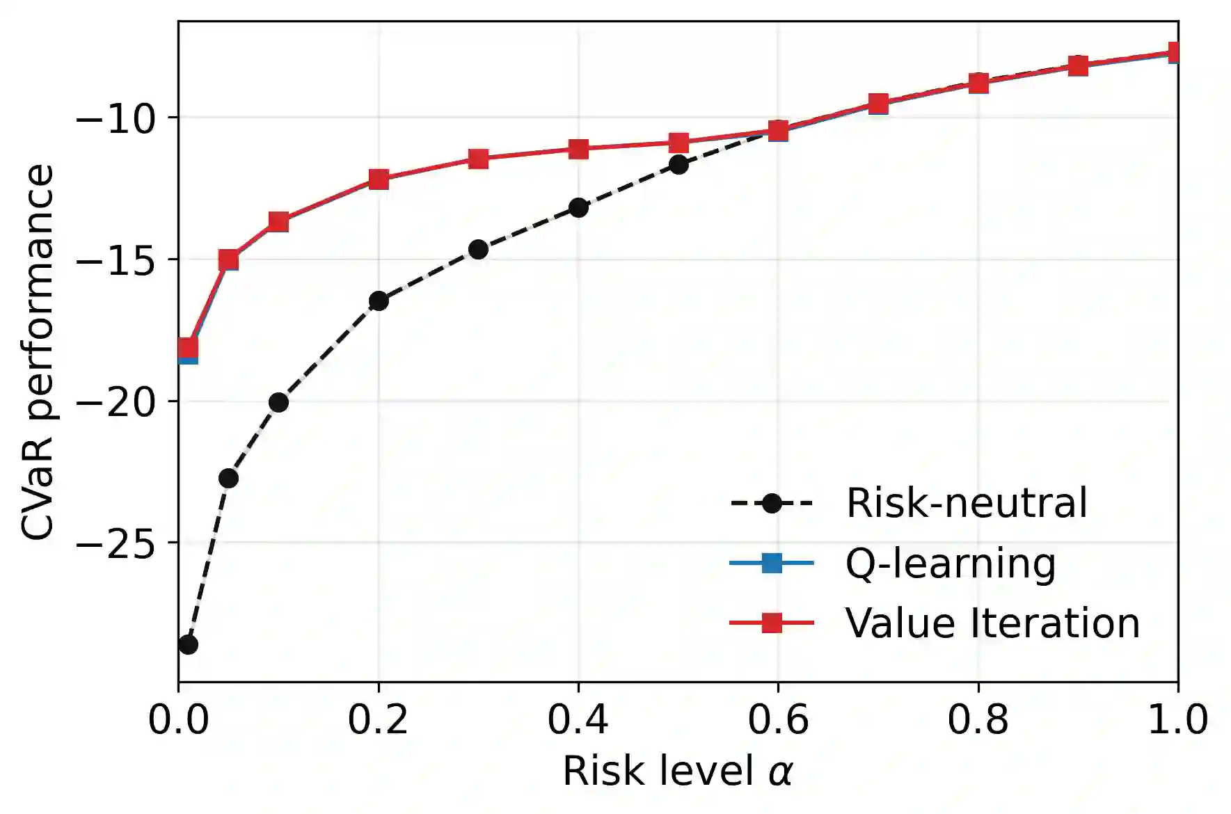 翻译:在安全关键型应用中,常采用静态条件风险价值(CVaR)等尾部风险度量来预防罕见但灾难性的事件。与风险中性目标不同,回报的静态CVaR依赖于完整轨迹序列,无法在底层马尔可夫决策过程中进行递归式贝尔曼分解。经典解决方案依赖于引入连续变量的状态扩展方法。然而,除非限制在特定类型的可容许值函数范围内,该公式会导致奖励稀疏化和退化不动点问题。本研究提出一种基于状态扩展的静态CVaR目标新公式。我们的替代方法导出的贝尔曼算子具有:(1)密集的逐步奖励;(2)在全有界值函数空间上的压缩特性。基于此理论框架,我们开发了风险规避值迭代算法和无模型Q学习算法,这两种算法均依赖于离散化扩展状态。我们进一步提供了收敛性保证和由离散化引起的近似误差界。实证结果表明,我们的算法能成功学习对CVaR敏感的策略,并实现有效的性能-安全权衡。