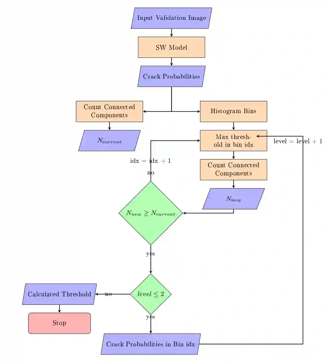 Automatically detecting or segmenting cracks in images can help in reducing the cost of maintenance or operations. Detecting, measuring and quantifying cracks for distress analysis in challenging background scenarios is a difficult task as there is no clear boundary that separates cracks from the background. Developed algorithms should handle the inherent challenges associated with data. Some of the perceptually noted challenges are color, intensity, depth, blur, motion-blur, orientation, different region of interest (ROI) for the defect, scale, illumination, complex and challenging background, etc. These variations occur across (crack inter class) and within images (crack intra-class variabilities). Overall, there is significant background (inter) and foreground (intra-class) variability. In this work, we have attempted to reduce the effect of these variations in challenging background scenarios. We have proposed a stochastic width (SW) approach to reduce the effect of these variations. Our proposed approach improves detectability and significantly reduces false positives and negatives. We have measured the performance of our algorithm objectively in terms of mean IoU, false positives and negatives and subjectively in terms of perceptual quality.