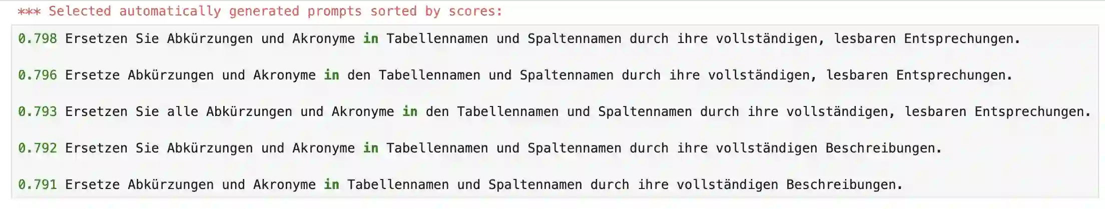 翻译:本文提出了一种自动提示工程系统,其设计与应用均更为简洁,且效果与现有方法相当。该系统无需调优,也无需明确的任务线索。我们在数据库表的隐晦列名扩展任务上评估了所提出的方法,该任务对于表格数据的搜索、访问和理解至关重要,但现有研究却极为匮乏。我们在英语和德语两种语言的数据集上进行了评估。这是首个将自动提示工程应用于列名扩展任务的研究工作。据我们所知,这也是首个将自动提示工程应用于英语以外语言的研究。