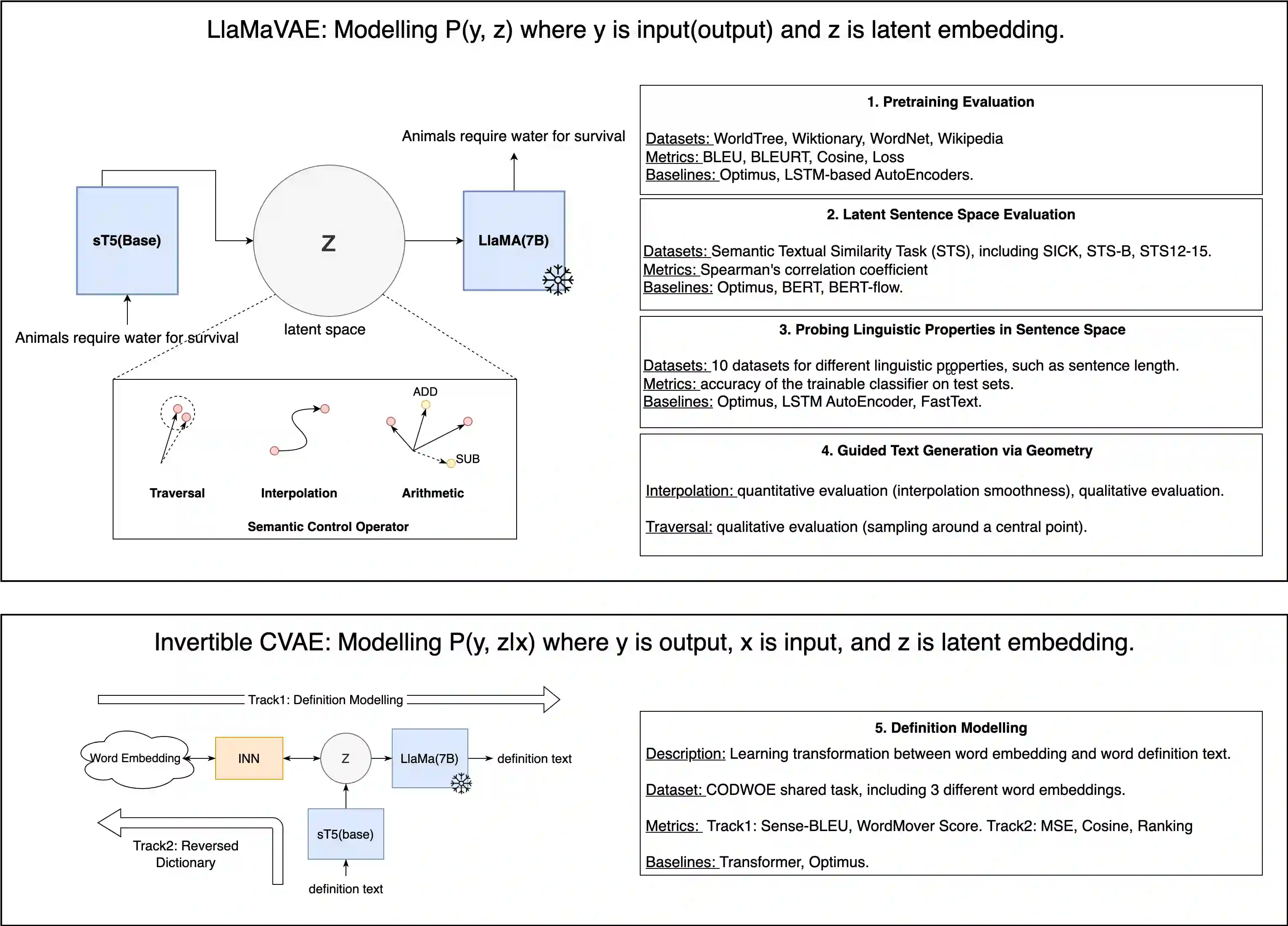 Deep generative neural networks, such as Variational AutoEncoders (VAEs), offer an opportunity to better understand and control language models from the perspective of sentence-level latent spaces. To combine the controllability of VAE latent spaces with the state-of-the-art performance of recent large language models (LLMs), we present in this work LlaMaVAE, which combines expressive encoder and decoder models (sentenceT5 and LlaMA) with a VAE architecture, aiming to provide better text generation control to LLMs. In addition, to conditionally guide the VAE generation, we investigate a new approach based on flow-based invertible neural networks (INNs) named Invertible CVAE. Experimental results reveal that LlaMaVAE can outperform the previous state-of-the-art VAE language model, Optimus, across various tasks, including language modelling, semantic textual similarity and definition modelling. Qualitative analysis on interpolation and traversal experiments also indicates an increased degree of semantic clustering and geometric consistency, which enables better generation control.