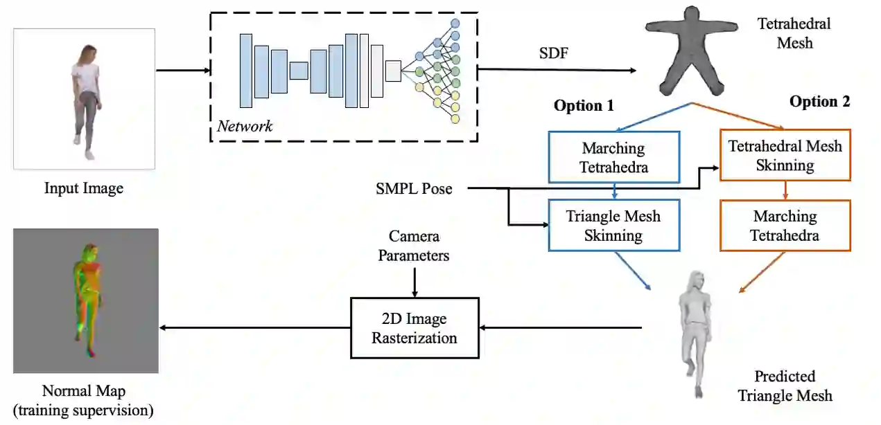 We present a novel deep learning-based approach to the 3D reconstruction of clothed humans using weak supervision via 2D normal maps. Given a single RGB image or multiview images, our network infers a signed distance function (SDF) discretized on a tetrahedral mesh surrounding the body in a rest pose. Subsequently, inferred pose and camera parameters are used to generate a normal map from the SDF. A key aspect of our approach is the use of Marching Tetrahedra to (uniquely) compute a triangulated surface from the SDF on the tetrahedral mesh, facilitating straightforward differentiation (and thus backpropagation). Thus, given only ground truth normal maps (with no volumetric information ground truth information), we can train the network to produce SDF values from corresponding RGB images. Optionally, an additional multiview loss leads to improved results. We demonstrate the efficacy of our approach for both network inference and 3D reconstruction.