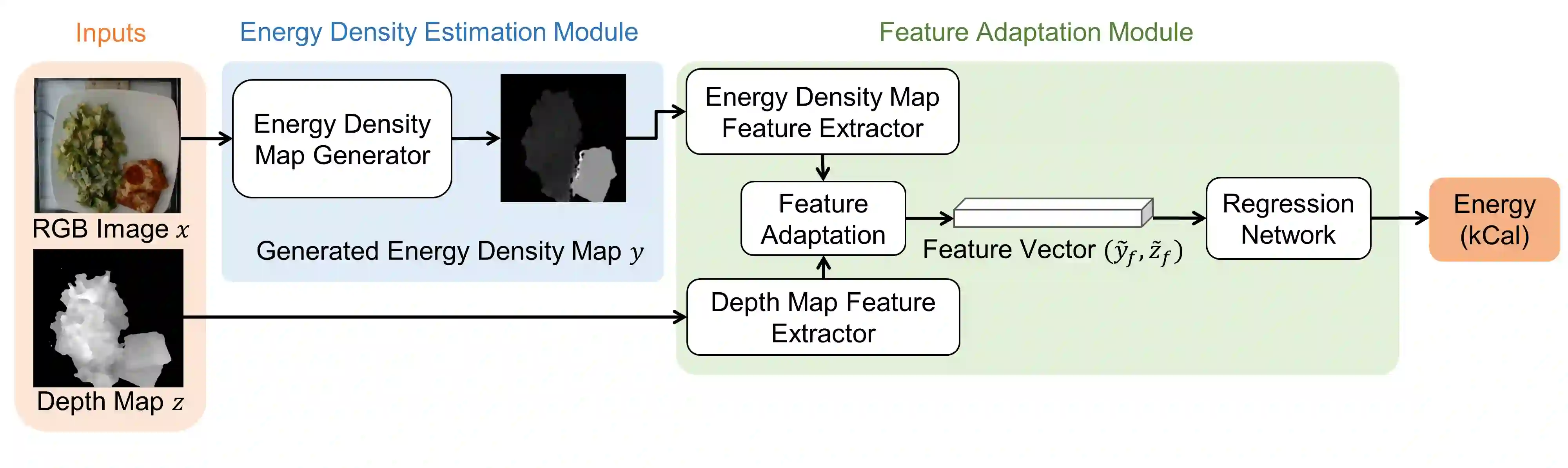 Assessment of dietary intake has primarily relied on self-report instruments, which are prone to measurement errors. Dietary assessment methods have increasingly incorporated technological advances particularly mobile, image based approaches to address some of these limitations and further automation. Mobile, image-based methods can reduce user burden and bias by automatically estimating dietary intake from eating occasion images that are captured by mobile devices. In this paper, we propose an "Energy Density Map" which is a pixel-to-pixel mapping from the RGB image to the energy density of the food. We then incorporate the "Energy Density Map" with an associated depth map that is captured by a depth sensor to estimate the food energy. The proposed method is evaluated on the Nutrition5k dataset. Experimental results show improved results compared to baseline methods with an average error of 13.29 kCal and an average percentage error of 13.57% between the ground-truth and the estimated energy of the food.