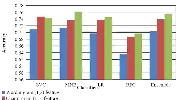 翻译:本文描述了由我们的团队KBCNMUJAL提交的系统,即我们团队KBCNMUJAL在信息检索评价论坛(信息检索评价论坛,2020年12月16日至20日,印度海得拉巴,印度海得拉巴)上提交的仇恨言语和攻击性内容识别共同任务任务任务2的任务2。两种Dravidian语言的数据集Viz、Malayalam和泰米尔大小4000的观测由HASOC组织者共享。这些数据集用于使用基于分类和回归模型的不同机器学习算法对机器进行培训。数据集包括Twitter或YouTube评论,其中两个类标签是攻击性的,而不是攻击性的。该机器经过训练,可以将这类社交媒体信息信息信息分为两类。适当的 ngram 数据集将学习仇恨言论短信的具体特性。这些功能模型以N-gram的TFIDF重量为基础。上述工作和相关实验显示,可以使用词、性质和性格的模型模型等特征来确定攻击性文字内容的术语模式。作为HASOC共享任务的一部分,用于进行该类的模型共享任务,测试数据系统,用于进行该测试。
