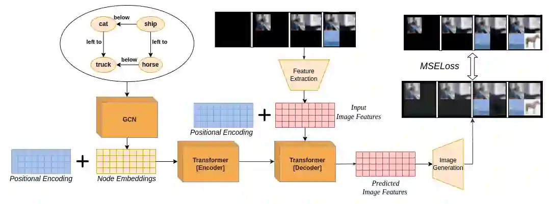 Generating images from semantic visual knowledge is a challenging task, that can be useful to condition the synthesis process in complex, subtle, and unambiguous ways, compared to alternatives such as class labels or text descriptions. Although generative methods conditioned by semantic representations exist, they do not provide a way to control the generation process aside from the specification of constraints between objects. As an example, the possibility to iteratively generate or modify images by manually adding specific items is a desired property that, to our knowledge, has not been fully investigated in the literature. In this work we propose a transformer-based approach conditioned by scene graphs that, conversely to recent transformer-based methods, also employs a decoder to autoregressively compose images, making the synthesis process more effective and controllable. The proposed architecture is composed by three modules: 1) a graph convolutional network, to encode the relationships of the input graph; 2) an encoder-decoder transformer, which autoregressively composes the output image; 3) an auto-encoder, employed to generate representations used as input/output of each generation step by the transformer. Results obtained on CIFAR10 and MNIST images show that our model is able to satisfy semantic constraints defined by a scene graph and to model relations between visual objects in the scene by taking into account a user-provided partial rendering of the desired target.