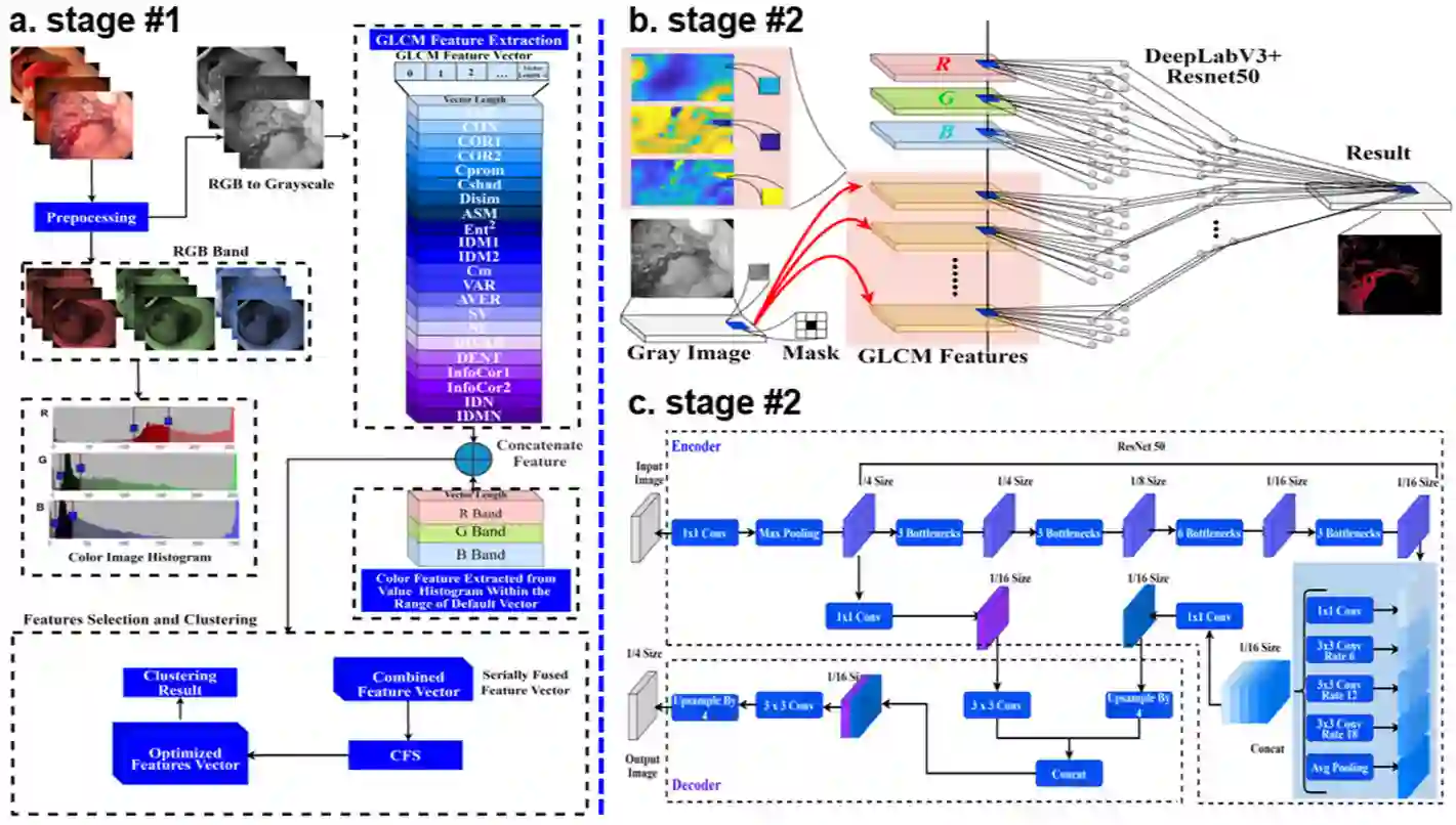 翻译:在内窥镜图像中对胃出血进行及时精确的分类与分割,对于胃部并发症的快速诊断和干预至关重要,这在挽救生命的医疗程序中具有关键意义。传统方法面临邻近其他胃组织的出血区域因强度值难以区分所带来的挑战。本研究旨在通过引入一种新颖的深度学习模型——双空间核化约束模糊C均值(Deep DuS-KFCM)聚类算法,彻底革新这一领域。该混合神经模糊系统将神经网络与模糊逻辑相结合,实现了对出血区域的高度精确和高效识别。模型采用由粗到精的两阶段分割策略:首先应用结合空间强度特征的增强型空间核化模糊C均值(SKFCM)算法进行初步处理,随后利用基于ResNet50架构的先进DeepLabv3+模型对分割结果进行精细化处理。通过在主流胃出血及红斑数据集上进行大量实验,我们的Deep DuS-KFCM模型取得了87.95%的准确率和96.33%的特异性,性能超越了现有分割方法。研究结果证明了该模型对噪声的鲁棒性及其卓越的分割能力,尤其在识别细微出血症状方面表现突出,从而标志着医学图像处理领域的一次重大飞跃。