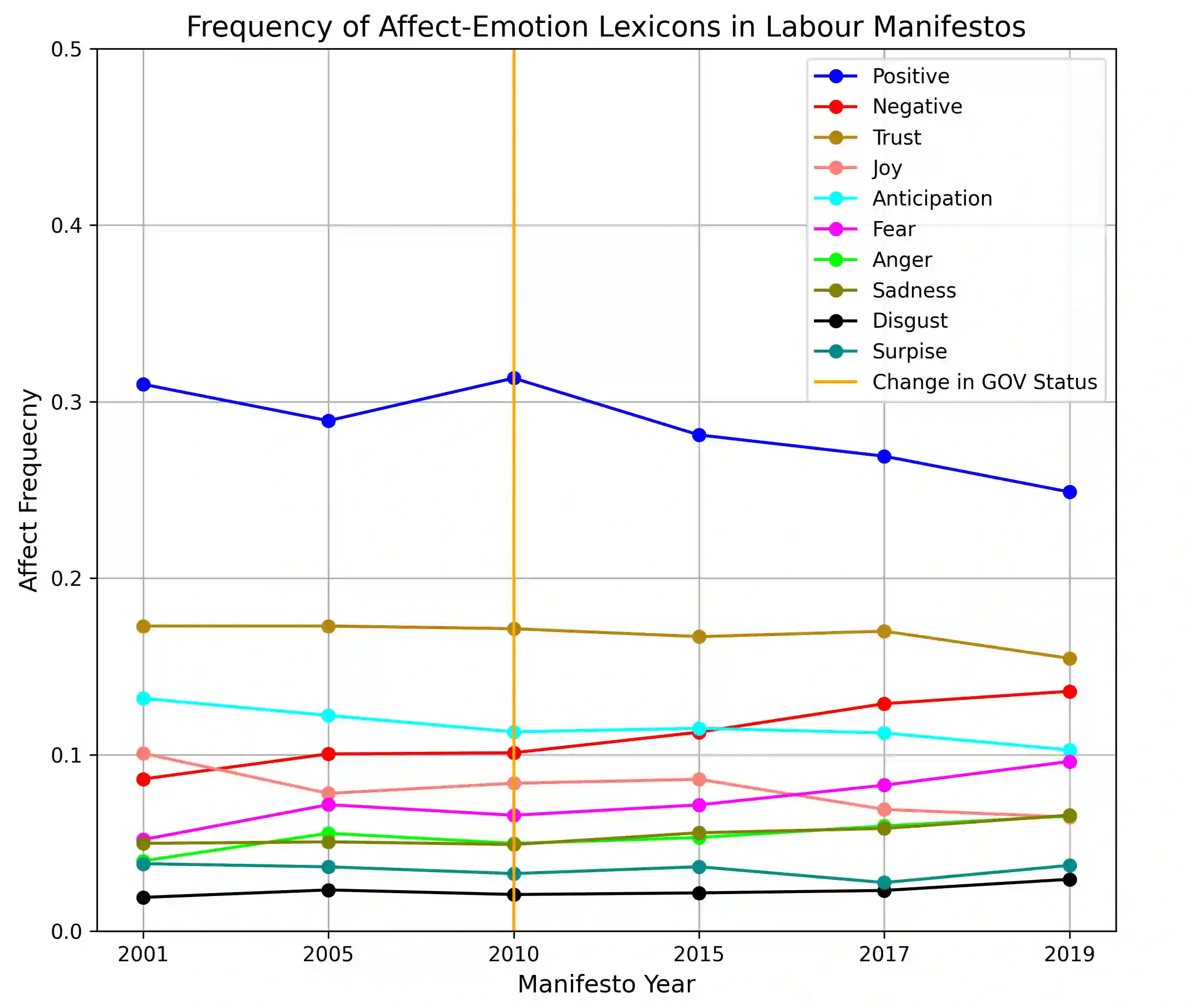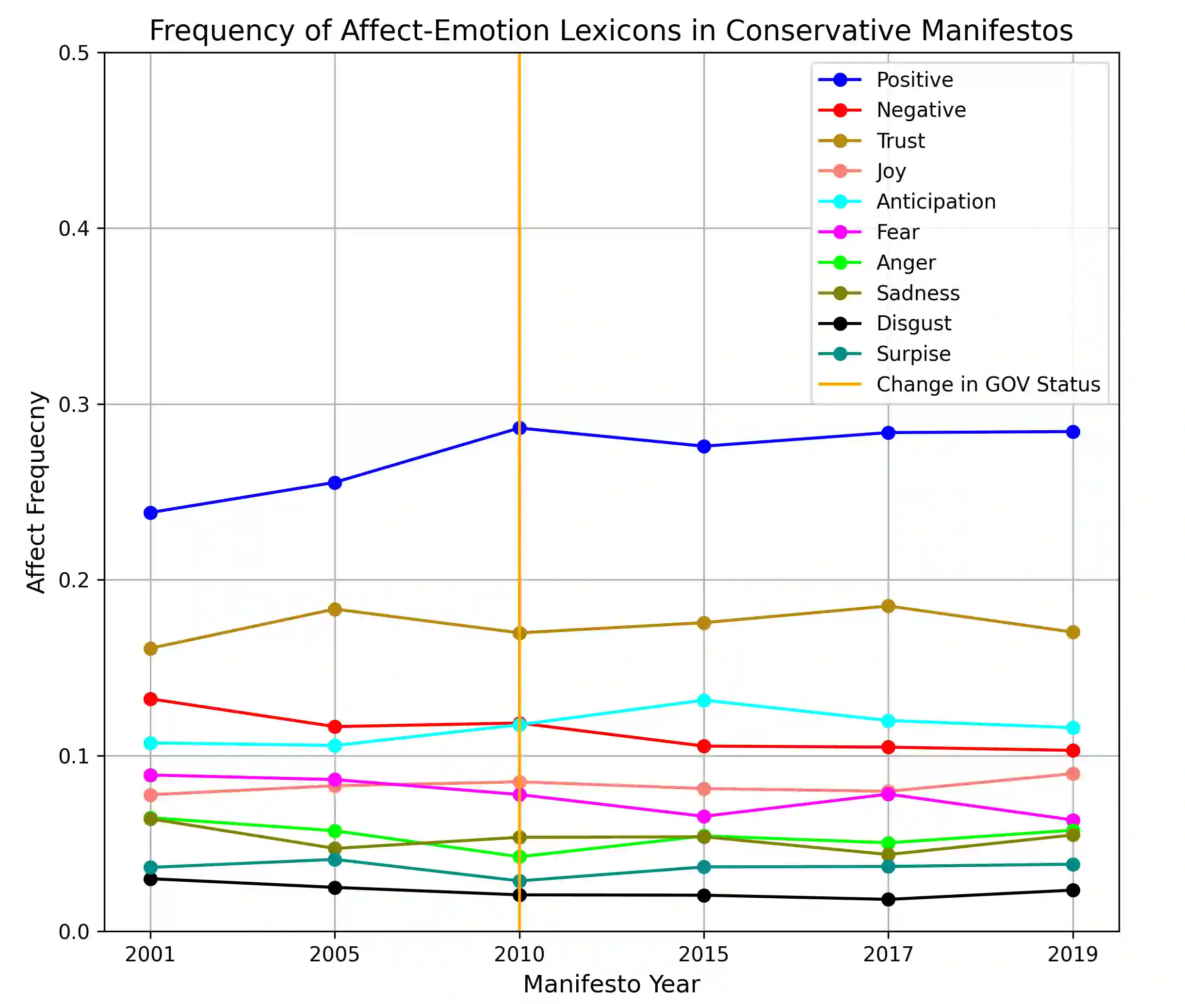The study involved the analysis of emotion-associated language in the UK Conservative and Labour party general election manifestos between 2000 to 2019. While previous research have shown a general correlation between ideological positioning and overlap of public policies, there are still conflicting results in matters of sentiments in such manifestos. Using new data, we present how valence level can be swayed by party status within government with incumbent parties presenting a higher frequency in positive emotion-associated words while negative emotion-associated words are more prevalent in opposition parties. We also demonstrate that parties with ideological similitude use positive language prominently further adding to the literature on the relationship between sentiments and party status.