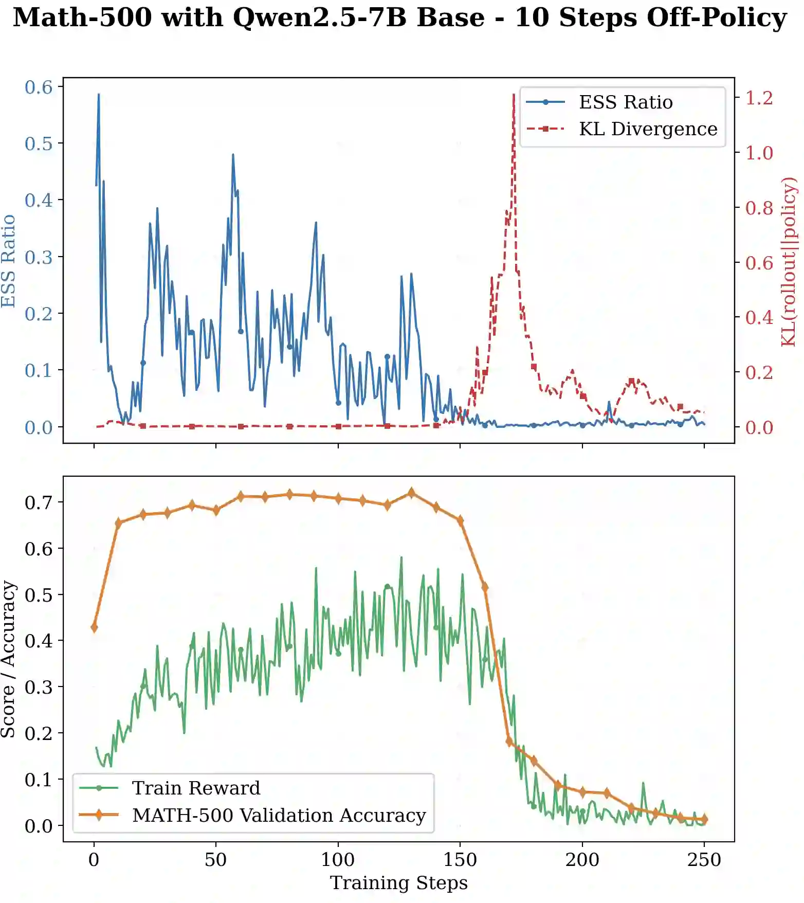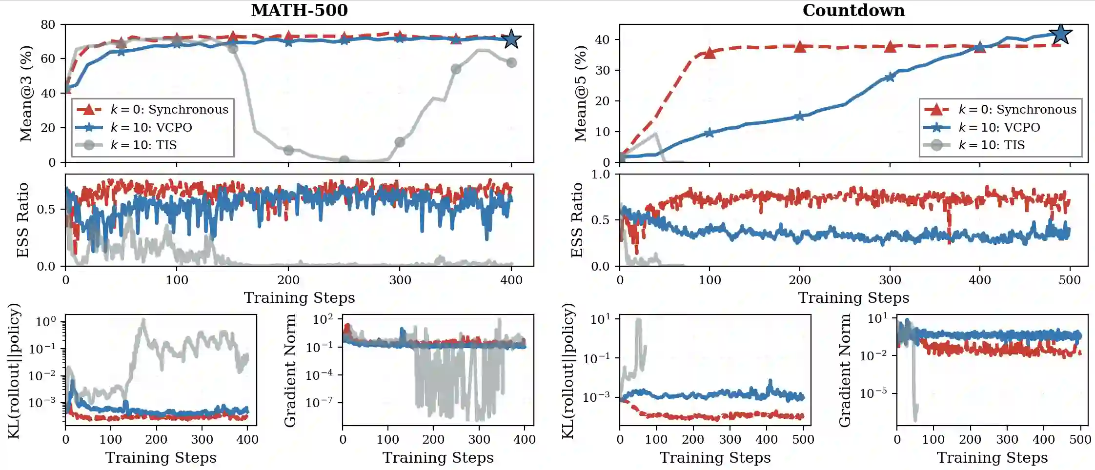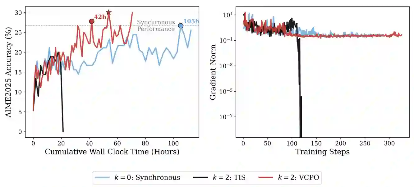 翻译:强化学习(RL)被广泛用于提升大语言模型在推理任务上的性能,而异步RL训练因其能提高端到端吞吐量而备受青睐。然而,对于广泛采用的无评论家策略梯度方法(如REINFORCE和GRPO),高异步性会导致策略梯度估计器的方差显著增大:在陈旧轨迹上进行训练会产生重尾的重要性比率,使得一小部分样本主导更新过程。这种放大效应使得梯度噪声增大,学习过程相对于匹配的在线训练而言变得不稳定。在数学和通用推理基准测试中,我们发现训练崩溃可通过有效样本量(ESS)和不稳定的梯度范数可靠地预测。基于此诊断,我们提出方差控制策略优化(VCPO),这是一种适用于REINFORCE/GRPO风格算法的通用稳定方法,其(i)根据有效样本量缩放学习率以抑制不可靠的更新,(ii)为离线策略设置应用闭式最小方差基线,无需辅助价值模型且仅增加极小的开销。实验表明,VCPO在数学、通用推理和工具使用任务的异步训练中显著提升了鲁棒性,其表现优于涵盖掩码/裁剪稳定器和算法变体在内的多种基线方法。该方法在匹配同步训练性能的同时,将长上下文、多轮次训练时间减少了2.5倍,证明显式控制策略梯度方差是实现大规模可靠异步强化学习的关键。