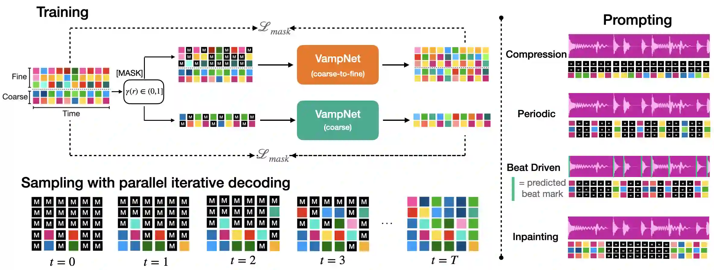 We introduce VampNet, a masked acoustic token modeling approach to music synthesis, compression, inpainting, and variation. We use a variable masking schedule during training which allows us to sample coherent music from the model by applying a variety of masking approaches (called prompts) during inference. VampNet is non-autoregressive, leveraging a bidirectional transformer architecture that attends to all tokens in a forward pass. With just 36 sampling passes, VampNet can generate coherent high-fidelity musical waveforms. We show that by prompting VampNet in various ways, we can apply it to tasks like music compression, inpainting, outpainting, continuation, and looping with variation (vamping). Appropriately prompted, VampNet is capable of maintaining style, genre, instrumentation, and other high-level aspects of the music. This flexible prompting capability makes VampNet a powerful music co-creation tool. Code and audio samples are available online.