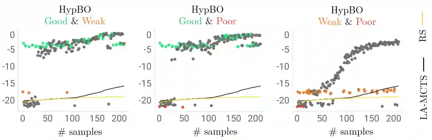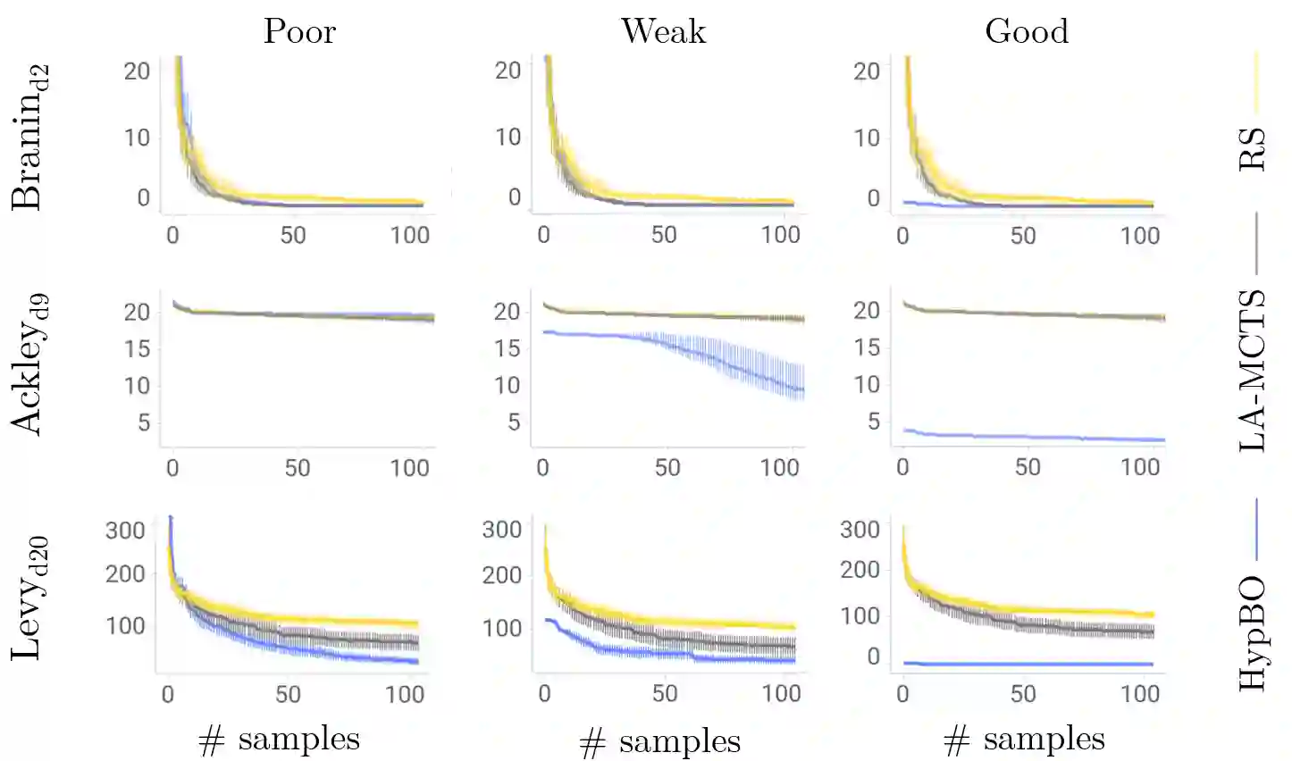 Robotics and automation offer massive accelerations for solving intractable, multivariate scientific problems such as materials discovery, but the available search spaces can be dauntingly large. Bayesian optimization (BO) has emerged as a popular sample-efficient optimization engine, thriving in tasks where no analytic form of the target function/property is known. Here we exploit expert human knowledge in the form of hypotheses to direct Bayesian searches more quickly to promising regions of chemical space. Previous methods have used underlying distributions derived from existing experimental measurements, which is unfeasible for new, unexplored scientific tasks. Also, such distributions cannot capture intricate hypotheses. Our proposed method, which we call HypBO, uses expert human hypotheses to generate an improved seed of samples. Unpromising seeds are automatically discounted, while promising seeds are used to augment the surrogate model data, thus achieving better-informed sampling. This process continues in a global versus local search fashion, organized in a bilevel optimization framework. We validate the performance of our method on a range of synthetic functions and demonstrate its practical utility on a real chemical design task where the use of expert hypotheses accelerates the search performance significantly.