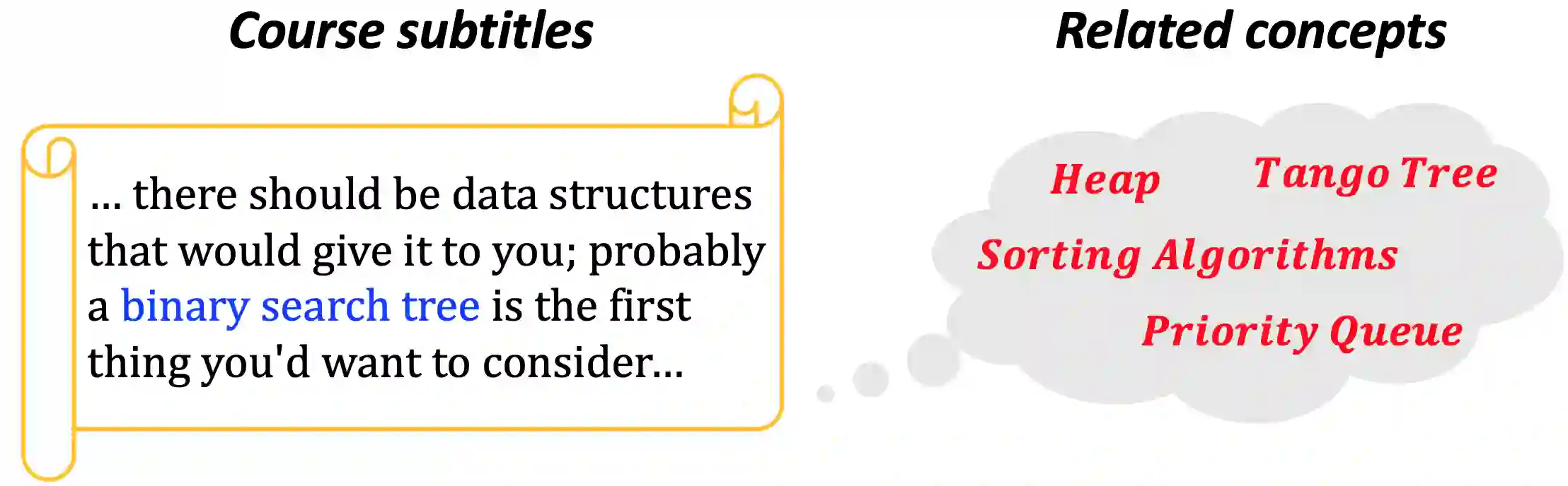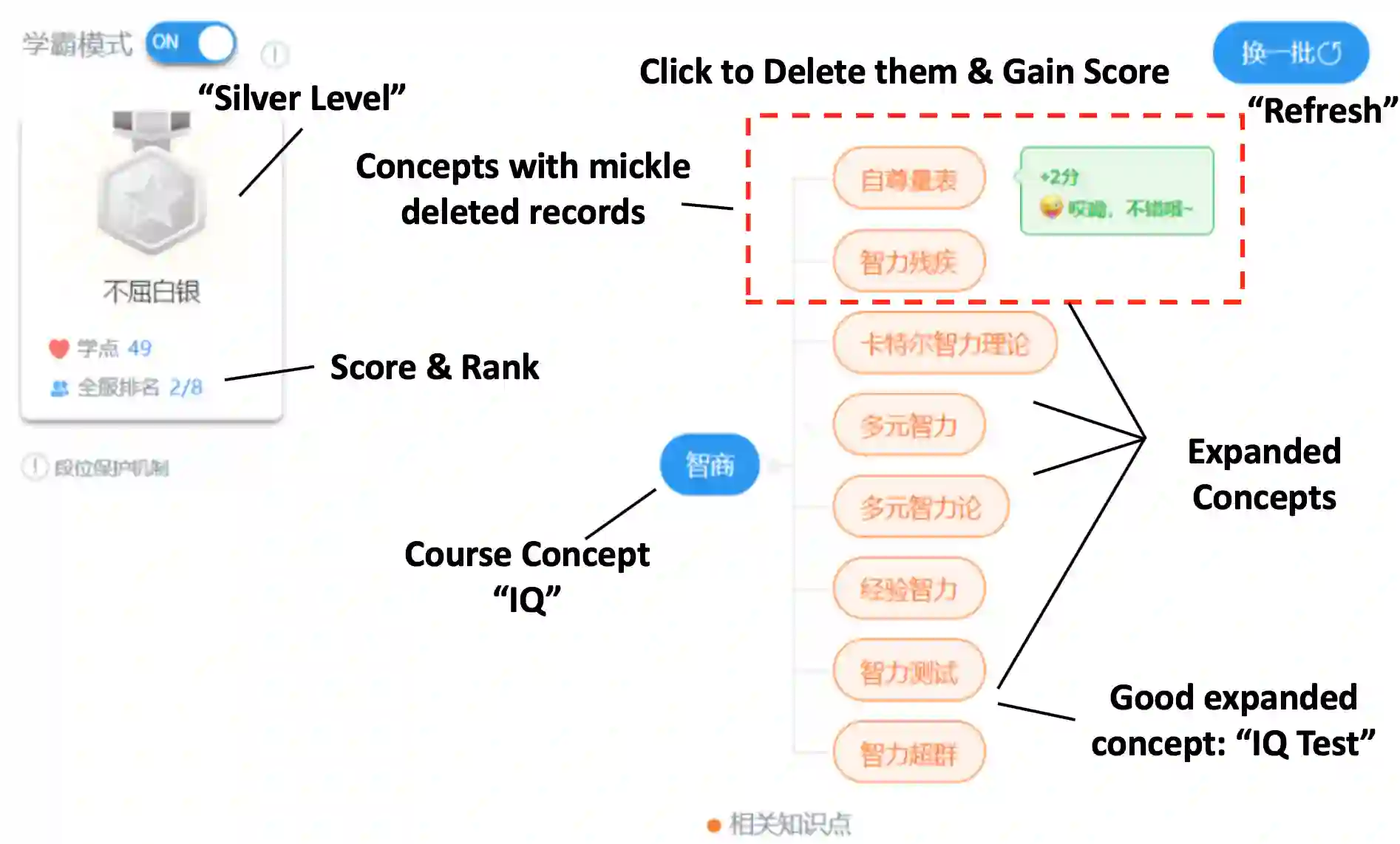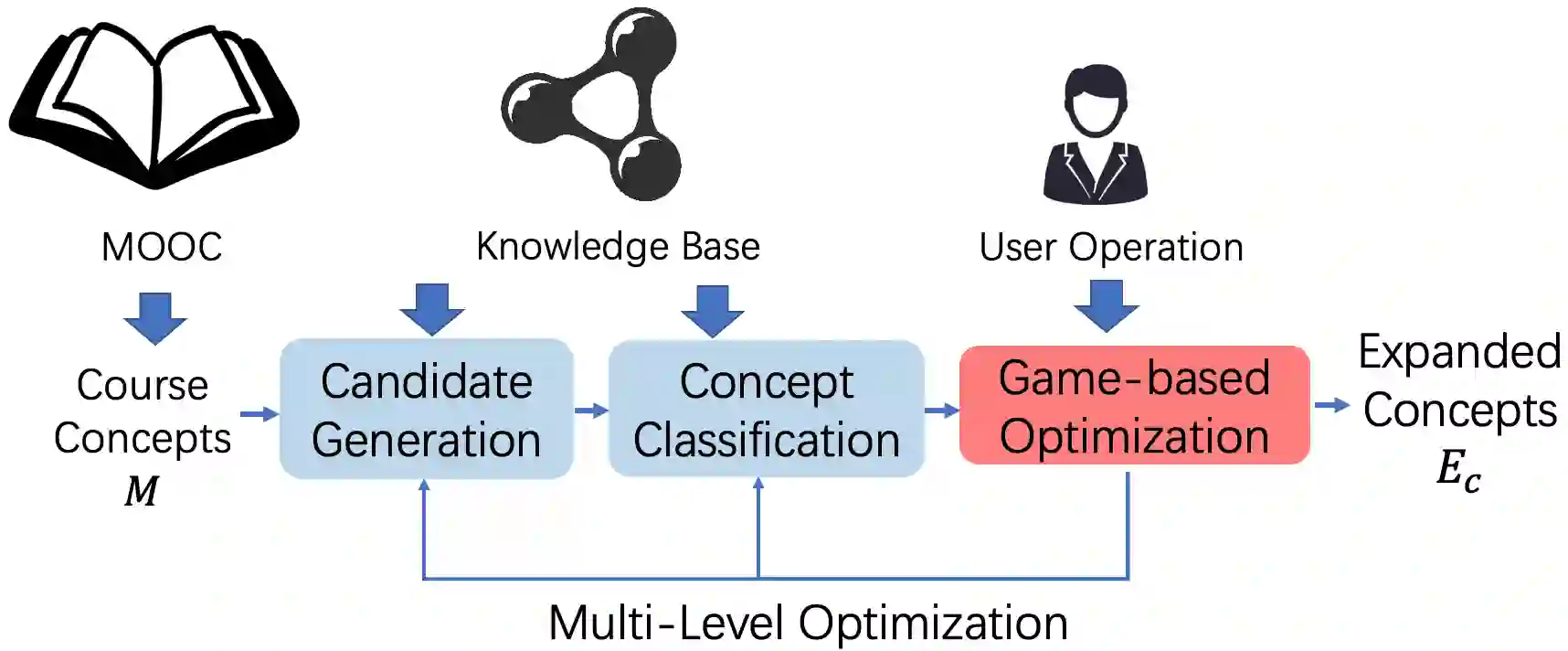 翻译:随着大规模开放在线课程(MOOCs)越来越受欢迎,它有望自动为MOOC用户提供课外知识。由于语义漂移和缺乏知识指导,现有方法无法在复杂的MOOC环境中有效地扩展课程概念。在本文中,我们首先在通过外部知识库寻找新概念时建立新的界限,然后利用多种特征来核实高质量的结果。此外,为了将人类的努力纳入我们的模型,我们还设计了一个基于游戏的互动式优化机制。我们对Couralesra和XueltangX的四套数据集的实验表明,拟议方法比现有方法(MAP+0.19)取得了显著改进。源代码和数据集已经公布。