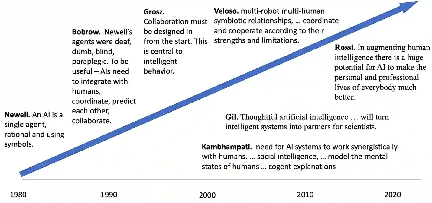 The vision of AI collaborators has long been a staple of science fiction, where artificial agents understand nuances of collaboration and human communication. They bring advantages to their human collaborators and teams by contributing their special talents. Government advisory groups and leaders in AI have advocated for years that AIs should be human compatible and be capable of effective collaboration. Nonetheless, robust AIs that can collaborate like talented people remain out of reach. This position paper draws on a cognitive analysis of what effective and robust collaboration requires of human and artificial agents. It sketches a history of public and AI visions for artificial collaborators, starting with early visions of intelligence augmentation (IA) and artificial intelligence (AI). It is intended as motivation and context for a second position paper on collaborative AI (Stefik & Price, 2023). The second paper reviews the multi-disciplinary state-of-the-art and proposes a roadmap for bootstrapping collaborative AIs.