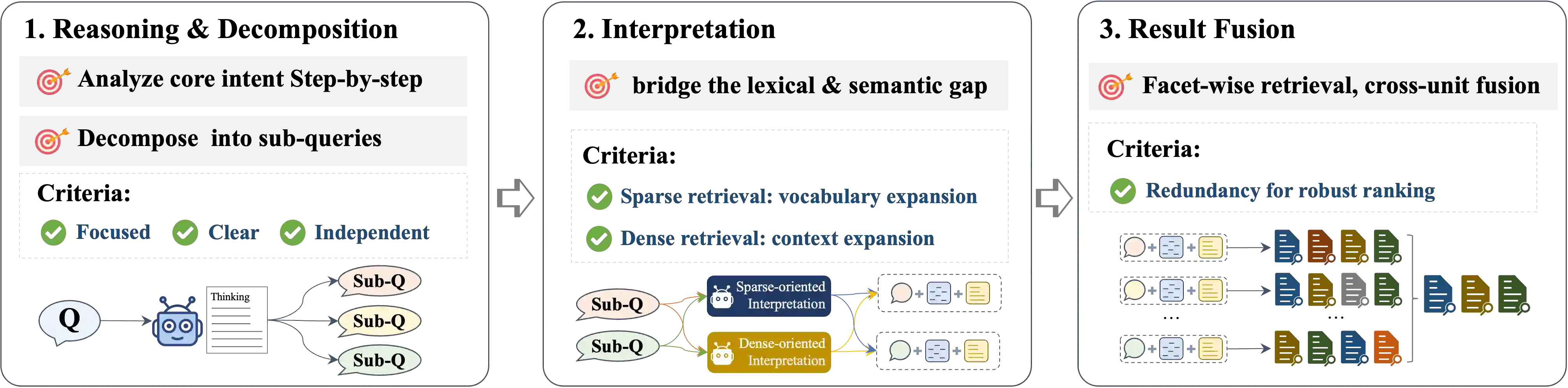 翻译:在现代搜索引擎中,准确推断用户意图对于提升文档检索效果至关重要。尽管大型语言模型(LLMs)在该领域已取得显著进展,但其有效性主要基于简短的关键词查询进行评估。随着人工智能驱动的搜索不断发展,具有复杂意图的长格式查询日益普遍,但在基于LLM的查询理解(QU)背景下,这类查询仍未得到充分探索。为弥补这一空白,我们提出了ReDI:一种通过分解与解释实现推理增强的查询理解方法。ReDI利用LLMs的推理与理解能力构建三阶段流程:(i)将复杂查询分解为目标明确的子查询,以精确捕捉用户意图;(ii)通过详细的语义解释丰富每个子查询,以改进查询-文档匹配;(iii)为每个子查询独立检索文档,并采用融合策略聚合结果以生成最终排序。我们从主流搜索引擎收集了大规模真实世界复杂查询数据集,并将教师模型的查询理解能力蒸馏至更小的模型以供实际应用。在BRIGHT和BEIR数据集上的实验表明,ReDI在稀疏检索和稠密检索范式中均持续超越强基线模型,验证了其有效性。代码发布于 https://anonymous.4open.science/r/ReDI-6FC7/。