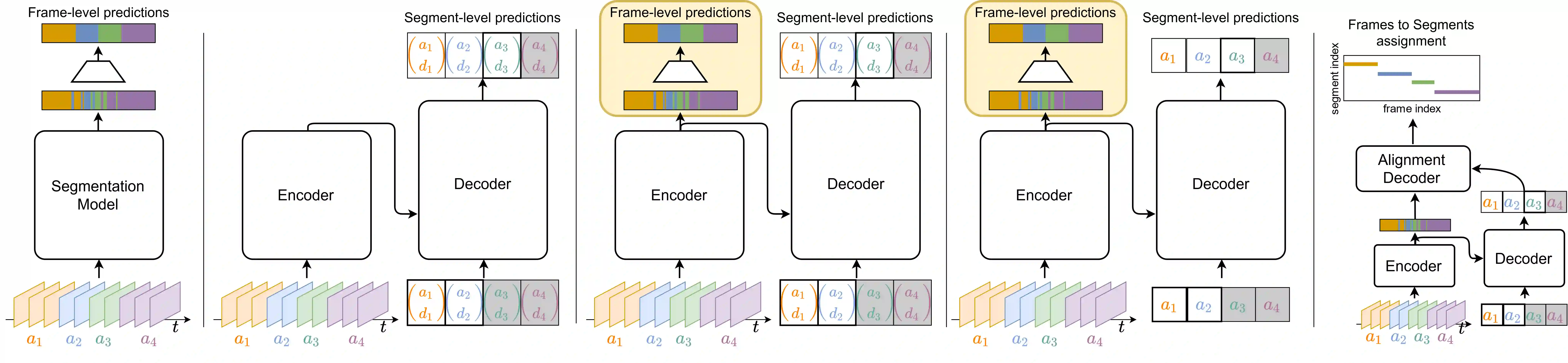 This paper introduces a unified framework for video action segmentation via sequence to sequence (seq2seq) translation in a fully and timestamp supervised setup. In contrast to current state-of-the-art frame-level prediction methods, we view action segmentation as a seq2seq translation task, i.e., mapping a sequence of video frames to a sequence of action segments. Our proposed method involves a series of modifications and auxiliary loss functions on the standard Transformer seq2seq translation model to cope with long input sequences opposed to short output sequences and relatively few videos. We incorporate an auxiliary supervision signal for the encoder via a frame-wise loss and propose a separate alignment decoder for an implicit duration prediction. Finally, we extend our framework to the timestamp supervised setting via our proposed constrained k-medoids algorithm to generate pseudo-segmentations. Our proposed framework performs consistently on both fully and timestamp supervised settings, outperforming or competing state-of-the-art on several datasets.