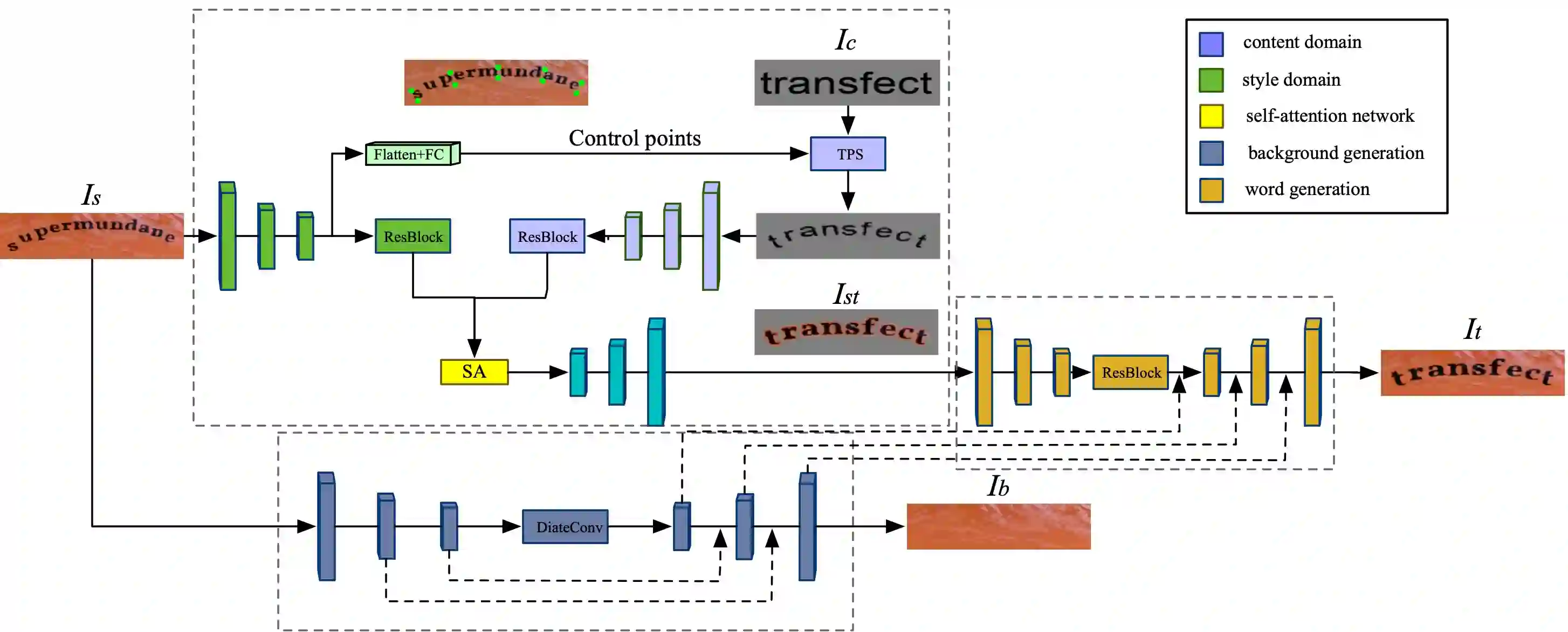 翻译:在保存原始字体、颜色、大小和背景纹理的同时交换现场图像中的文本是一项艰巨的任务,因为不同因素之间的相互作用复杂。 在这项工作中,我们展示了 SwapText, 这是一个三阶段框架,用于在场景图像之间传输文本。 首先,我们建议建立一个新颖的文本互换网络,仅取代前景图像中的文本标签。 其次,我们学习了一个背景完成网络,以重建背景图像。 最后,通过聚合网络,生成的地表图像和背景图像被用来生成文字图像。我们可以利用提议框架来操纵输入图像的文本,即使有严重的几何扭曲。 在若干场景文本数据集中,包括常规和不规则文本数据集,都展示了定性和定量结果。 我们进行了广泛的实验,以证明我们方法的有用性,例如基于图像的文本翻译、文本图像合成等。