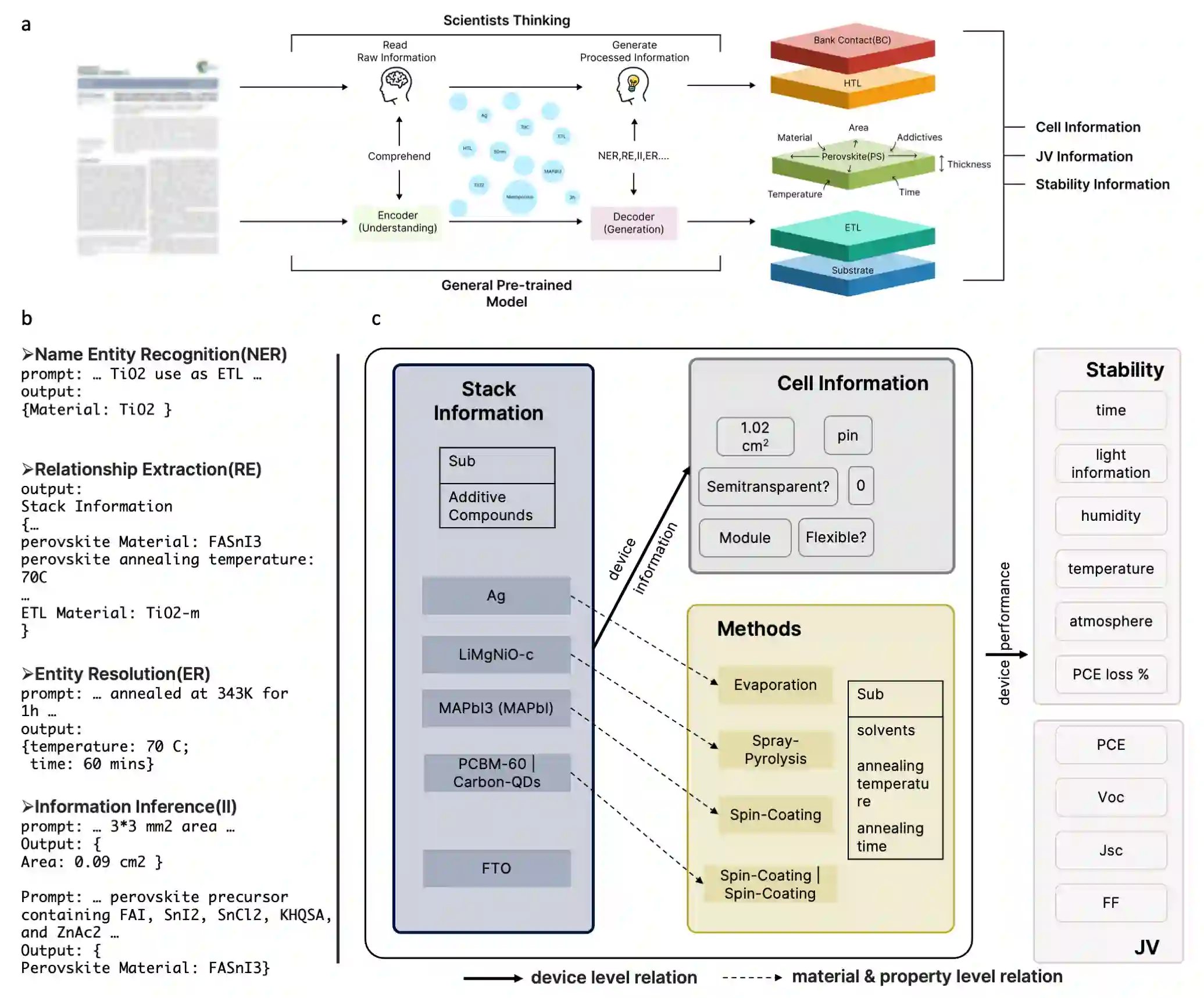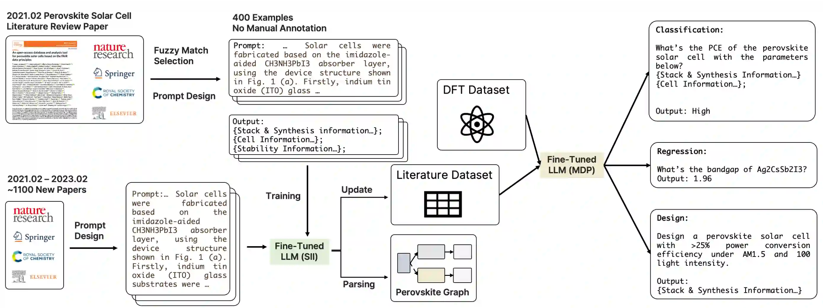 翻译:数据量在探索前沿材料方面具有越来越重要的意义,人工或自动化方法已经生成了许多数据集。然而,在应用学科中,材料的评估是基于其设备性能而不是其特性,材料科学领域难以有效利用数据的丰富性。本文提出了一种新的自然语言处理(NLP)任务,称为结构化信息推断(SII),以解决材料科学中设备级别信息提取的复杂性。我们通过调整GPT-3中的现有钙钛矿太阳能电池FAIR(可发现,可访问,可互操作,可重复使用)数据集来完成这项任务,获得了91.8%的F1分数,并扩展了自发布以来发表的数据。生成的数据格式化和标准化,使其可以直接用作后续数据分析的输入。此功能使材料科学家可以通过选择其领域内的高质量综述文章来开发模型。此外,我们设计了实验,使用大型语言模型(LLMs)预测太阳能电池的电气性能并设计具有定向参数的材料或设备。我们的结果表明,不需要特征选择,大语言模型具有获得科学知识和设计新材料的潜力,类似于材料科学家。