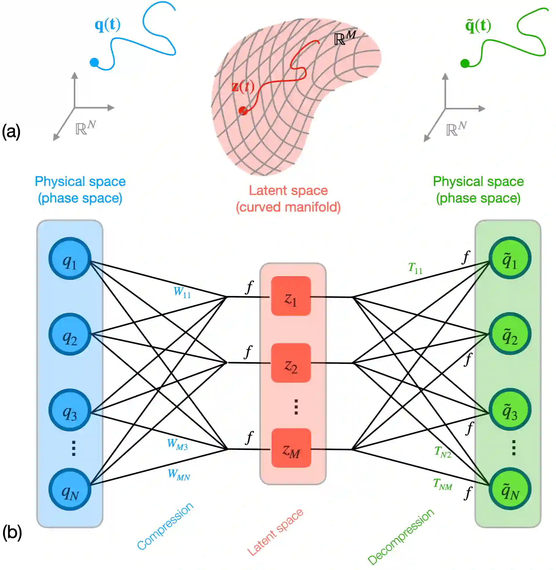 翻译:动荡流的动态在统计性固定状态下只能占据部分阶段空间。 从动态系统的观点看, 这部分是吸引器。 动荡吸引器的知识对以下两个目的至少有用:(一) 我们可以从物理上洞察动荡( 吸引器的形状和几何? ), (二) 它为准确描述动荡动态提供了最小的自由度。 自动进化器能够计算出一个最佳的潜潜伏空间, 这是一种动态的低顺序代表器。 如果经过适当培训和正确设计, 自动进化器可以学习动荡吸引器的近似, 如 Doan、 Racca 和 Magri (2022年) 所示 。 在本文中, 我们可以从理论上解释一个自动变形变形器的变形。 首先, 我们指出, 潜伏空间是一个曲线的曲线, 可以使用来自 Riemann 几何测量的简单工具加以分析。 其次, 我们用数学来描述暗层空间的地基值变值特性。 我们从数学角度推导出调调的直径阵列空间流,, 也就是地变变变形法, 。