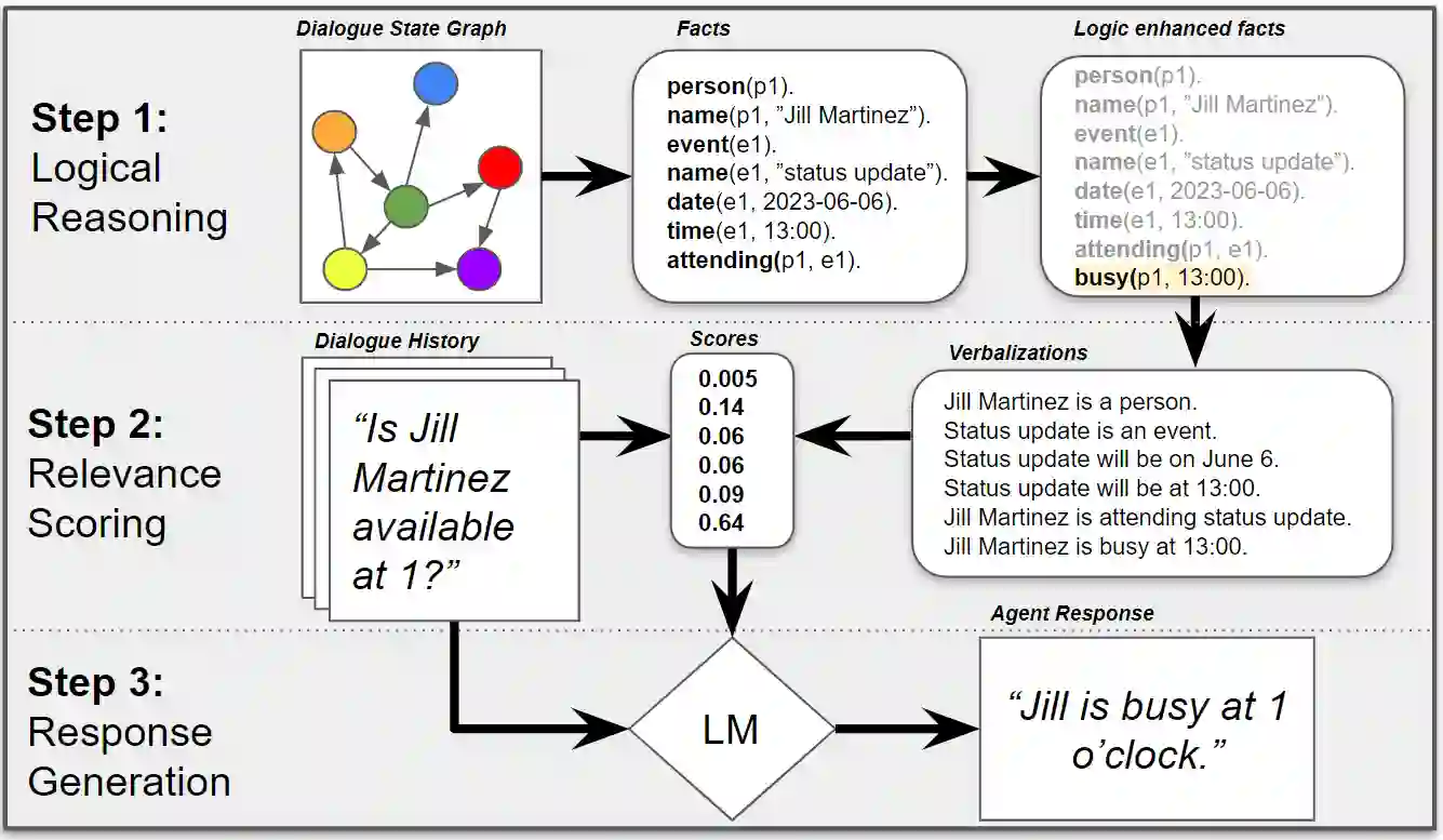 Constructing responses in task-oriented dialogue systems typically relies on information sources such the current dialogue state or external databases. This paper presents a novel approach to knowledge-grounded response generation that combines retrieval-augmented language models with logical reasoning. The approach revolves around a knowledge graph representing the current dialogue state and background information, and proceeds in three steps. The knowledge graph is first enriched with logically derived facts inferred using probabilistic logical programming. A neural model is then employed at each turn to score the conversational relevance of each node and edge of this extended graph. Finally, the elements with highest relevance scores are converted to a natural language form, and are integrated into the prompt for the neural conversational model employed to generate the system response. We investigate the benefits of the proposed approach on two datasets (KVRET and GraphWOZ) along with a human evaluation. Experimental results show that the combination of (probabilistic) logical reasoning with conversational relevance scoring does increase both the factuality and fluency of the responses.