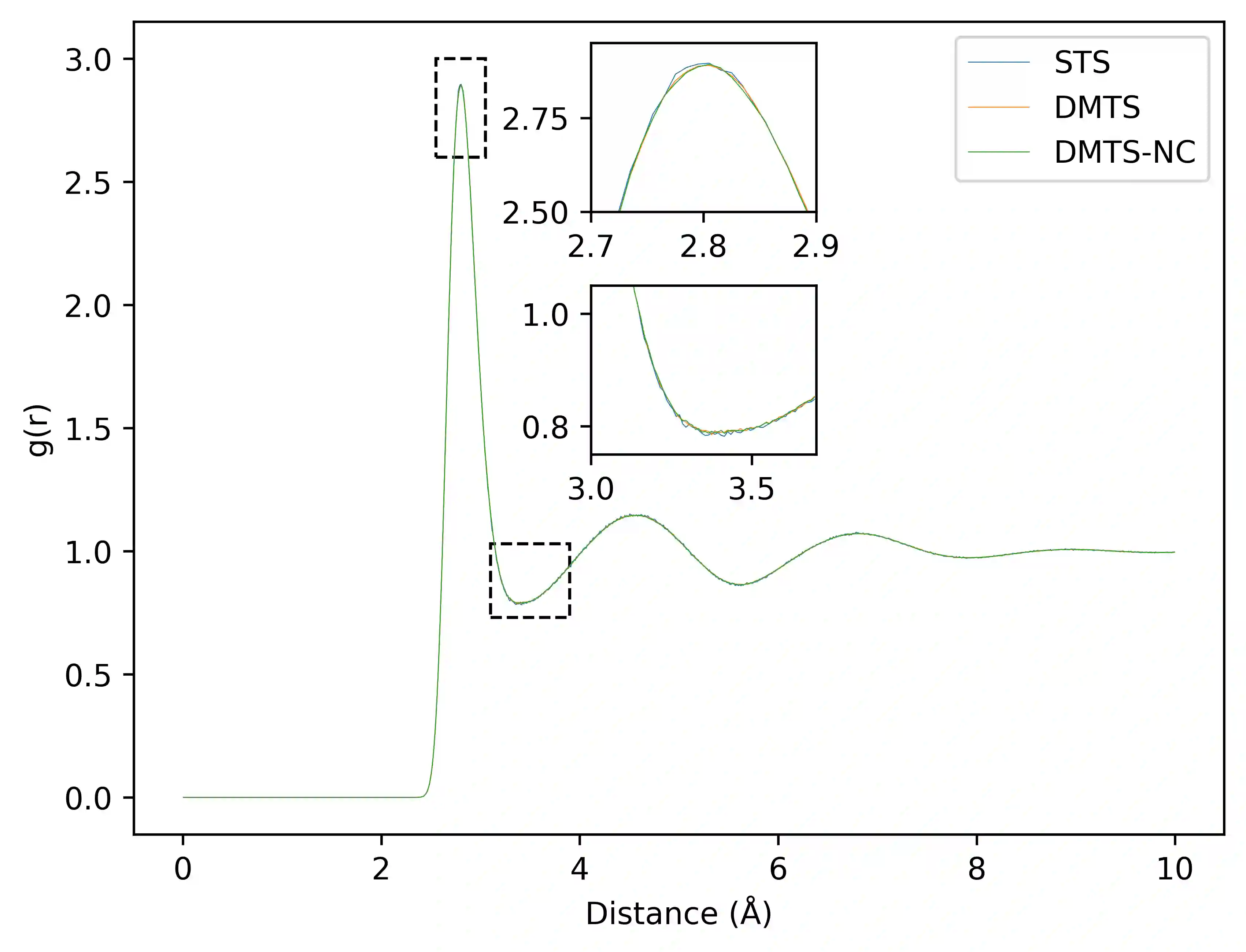 翻译:基于我们先前的工作(J. Phys. Chem. Lett., 2026, 17, 5, 1288-1295),本文提出DMTS-NC方法,这是一种利用非保守力进行蒸馏多时间步的策略,旨在进一步加速基于基础神经网络模型的原子分子动力学模拟。该方法采用双级可逆参考系统传播子算法形式体系,将目标精确的保守势与一个经过优化、用于生成非保守力的简化蒸馏表示相耦合。尽管是非保守的,该蒸馏架构被设计为强制满足关键的物理先验,例如旋转等变性及原子力分量的抵消。这些选择促进了蒸馏过程,从而极大提升了模拟的鲁棒性,显著减少了简化势中的“空洞”,因此与力数据达到了极好的一致性。总体而言,DMTS-NC方案比其保守对应方案更稳定高效,相较于DMTS实现了额外的15-30%加速。该方法无需微调步骤,更易于实现,并可推至系统物理共振的极限以保持精度,同时提供最大效率。与DMTS一样,DMTS-NC适用于任何神经网络势。