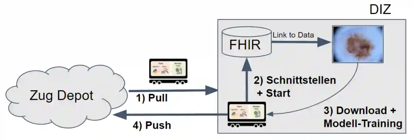 Skin cancer is the most common cancer type. Usually, patients with suspicion of cancer are treated by doctors without any aided visual inspection. At this point, dermoscopy has become a suitable tool to support physicians in their decision-making. However, clinicians need years of expertise to classify possibly malicious skin lesions correctly. Therefore, research has applied image processing and analysis tools to improve the treatment process. In order to perform image analysis and train a model on dermoscopic images data needs to be centralized. Nevertheless, data centralization does not often comply with local data protection regulations due to its sensitive nature and due to the loss of sovereignty if data providers allow unlimited access to the data. A method to circumvent all privacy-related challenges of data centralization is Distributed Analytics (DA) approaches, which bring the analysis to the data instead of vice versa. This paradigm shift enables data analyses - in our case, image analysis - with data remaining inside institutional borders, i.e., the origin. In this documentation, we describe a straightforward use case including a model training for skin lesion classification based on decentralised data.