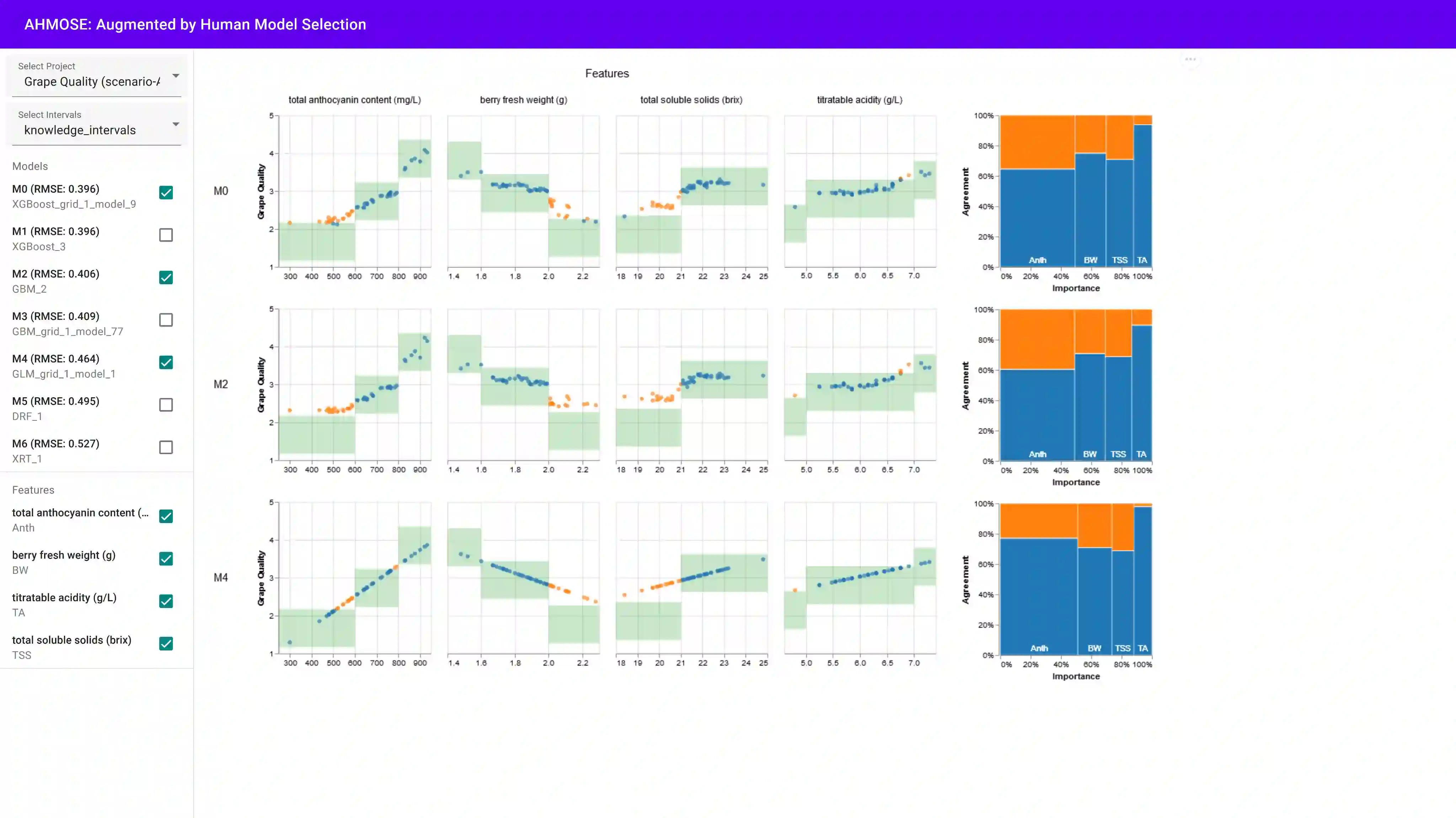 Decision support systems have become increasingly popular in the domain of agriculture. With the development of Automated Machine Learning, agricultural experts are now able to train, evaluate and make predictions using cutting edge machine learning (ML) models without the need for much ML knowledge. Although this automated approach has led to successful results in many scenarios, in certain cases (e.g., when few labeled datasets are available) choosing among different models with similar performance metrics is a difficult task. Furthermore, these systems do not commonly allow users to incorporate their domain knowledge that could facilitate the task of model selection, and to gain insight into the prediction system for eventual decision making. To address these issues, in this paper we present AHMoSe, a visual support system that allows domain experts to better understand, diagnose and compare different regression models, primarily by enriching model-agnostic explanations with domain knowledge. To validate AHMoSE, we describe a use case scenario in the viticulture domain, grape quality prediction, where the system enables users to diagnose and select prediction models that perform better. We also discuss feedback concerning the design of the tool from both ML and viticulture experts.